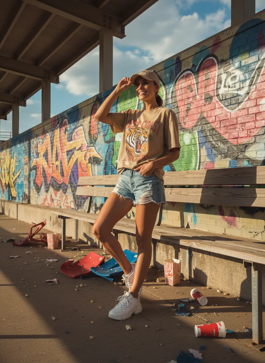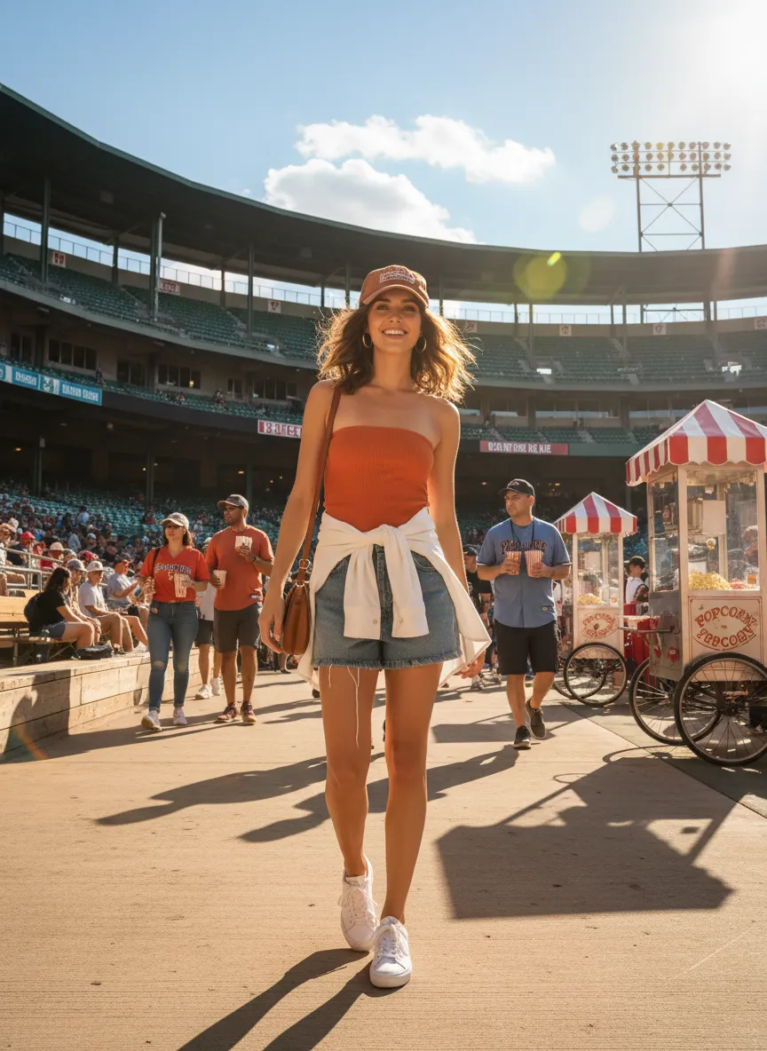 An orange tube top brings a fun pop of color to the stadium. Pair it with some baggy light wash jeans for a relaxed aesthetic. Throw on a navy blue baseball cap to tie the whole team color palette together.