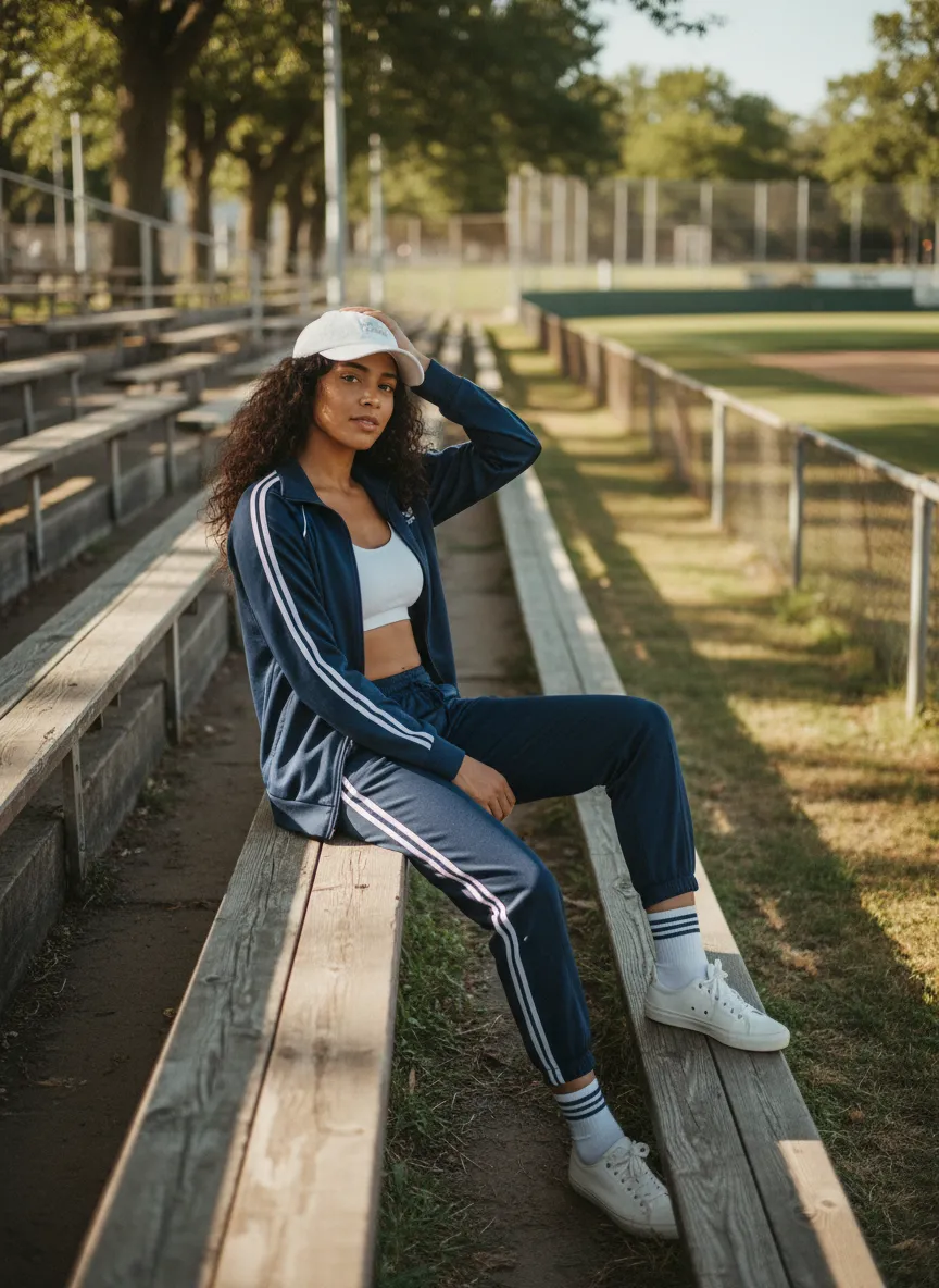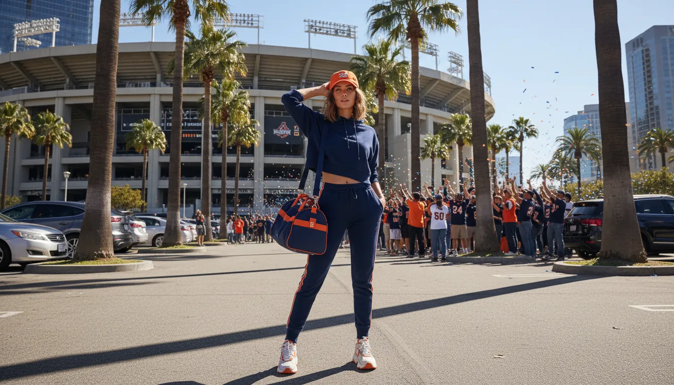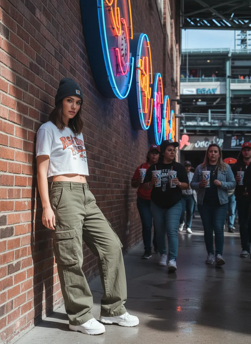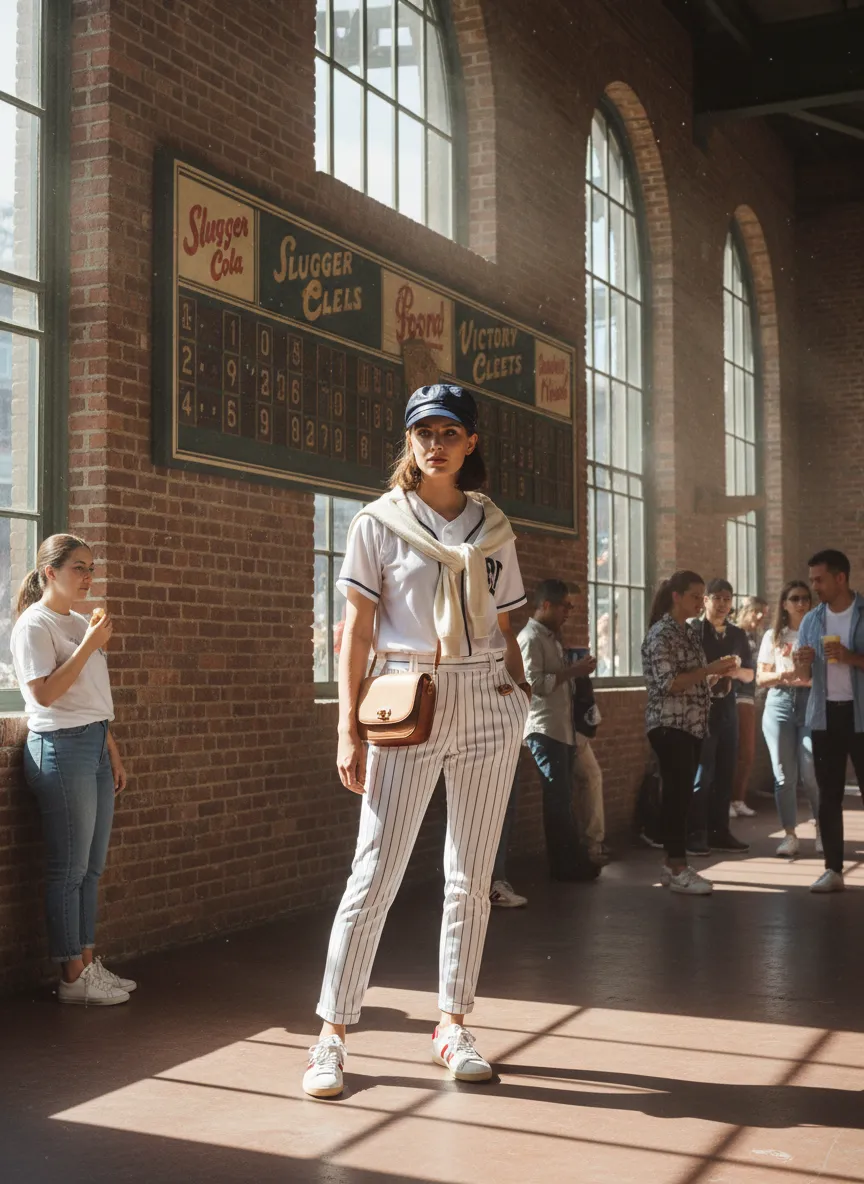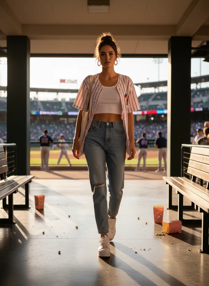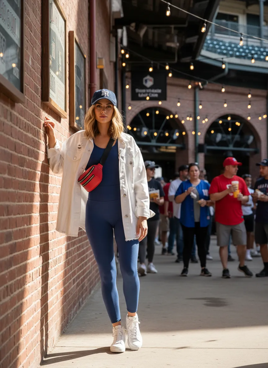 This feels a bit more elevated than regular jeans but fits the stadium environment perfectly. Add some sleek white sneakers to keep it grounded.