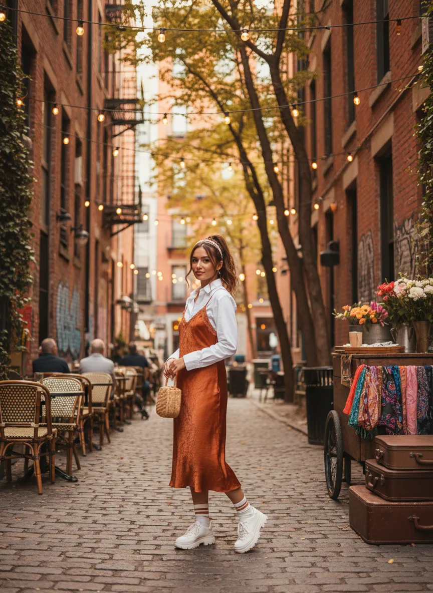 A silky orange slip dress is an unexpected but gorgeous choice for a game. Layer a white baby tee underneath it to make it feel more casual.