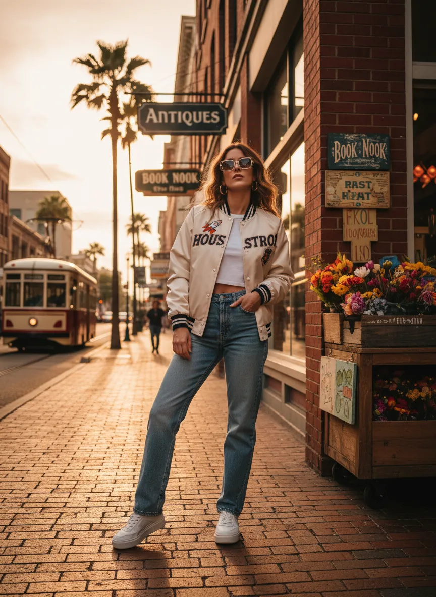 A satin bomber jacket with team patches is a major statement piece. Keep your base outfit simple with black jeans and a plain white tee.