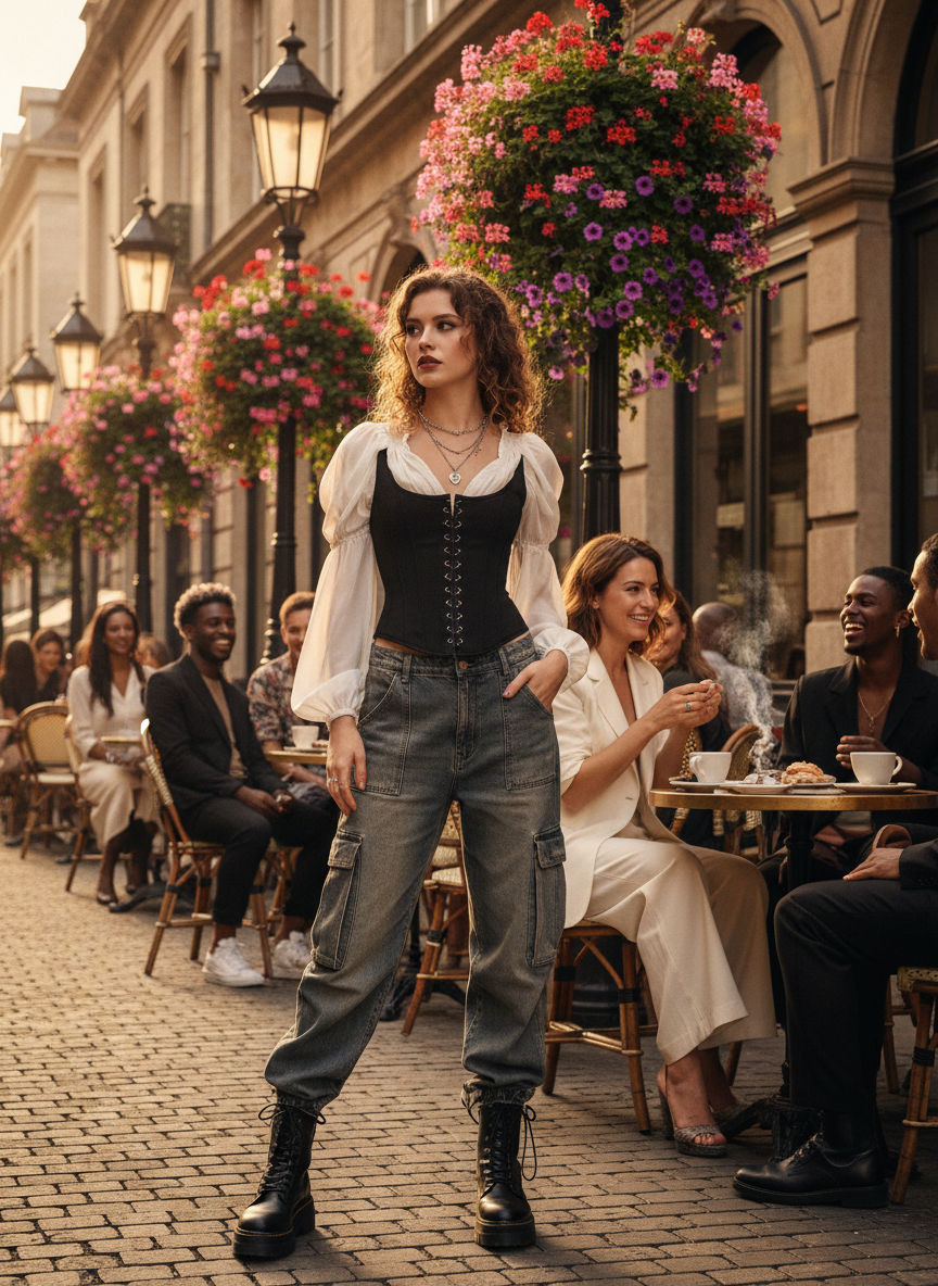 Mix edgy and feminine vibes by pairing a structured corset with loose denim. The structure of the bodice looks so good against the relaxed fit of the pants. It creates an hourglass shape even with wide legs.