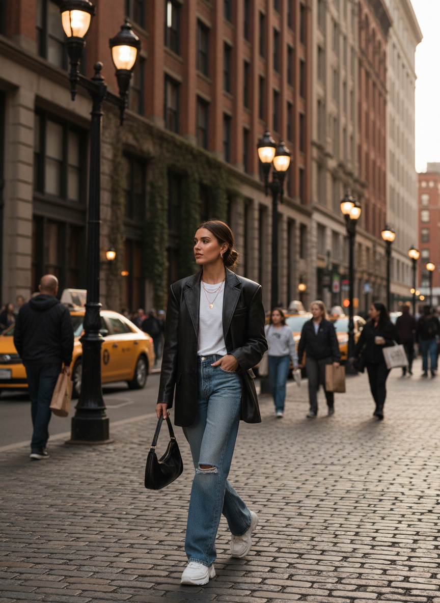 Throwing a leather jacket over your look instantly makes it sharper. The boxy shoulders of the blazer match the wide structure of the pants. It gives off a very model off-duty energy that works for almost any occasion. Wear a simple white tank underneath to keep it grounded.