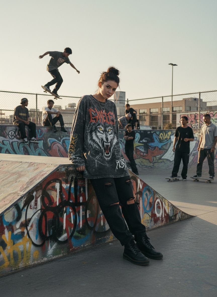 Layer a graphic tee over a long sleeve shirt for that skater boy look. It adds dimension and warmth without being too heavy. The loose pants complete the grunge aesthetic.