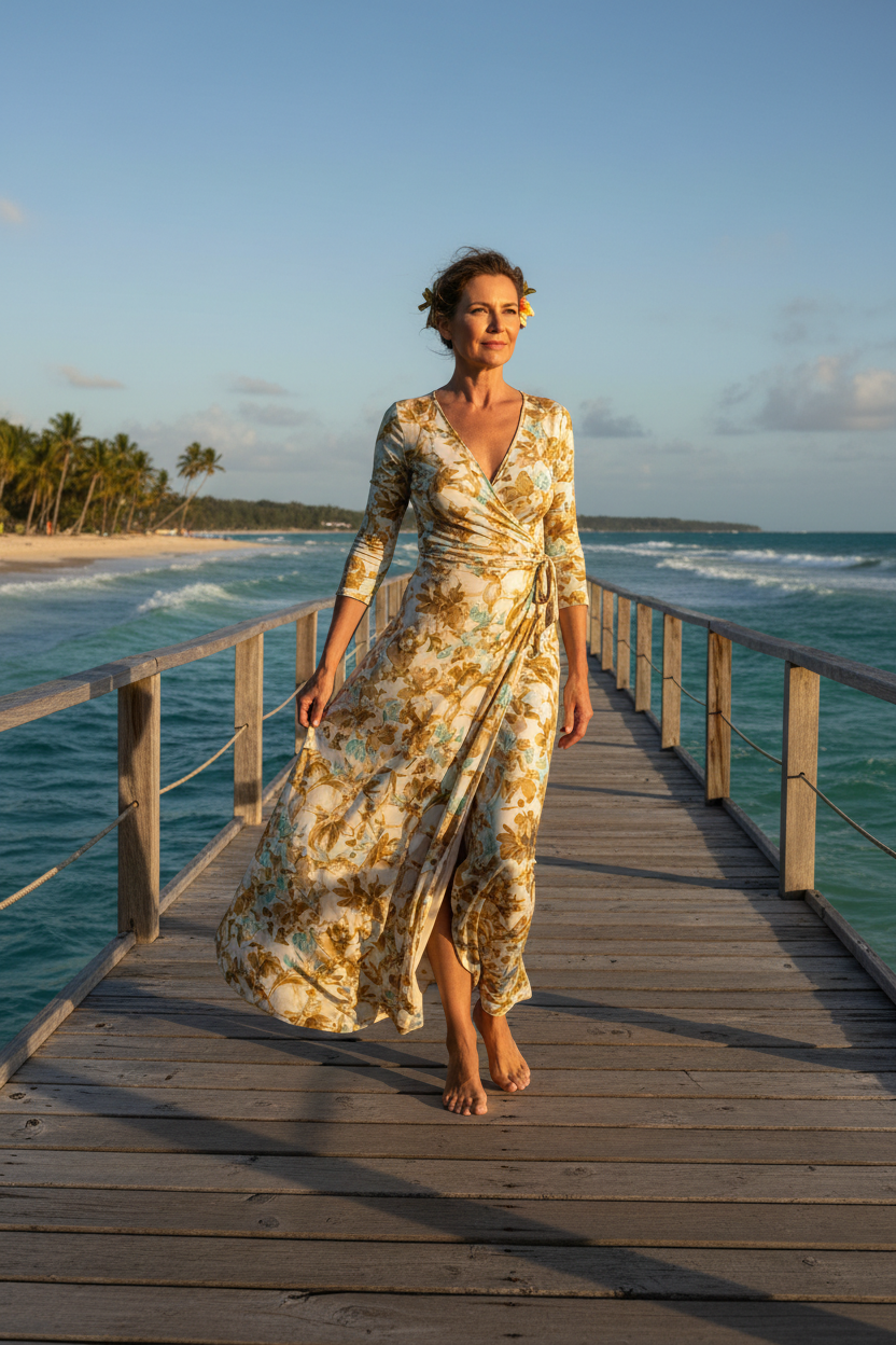 A wrap style maxi dress is very flattering for every body type. The movement of the skirt looks great for pictures by the ocean. Choose a floral print for a fun tropical touch. It is easy to dress up or down with different shoes.