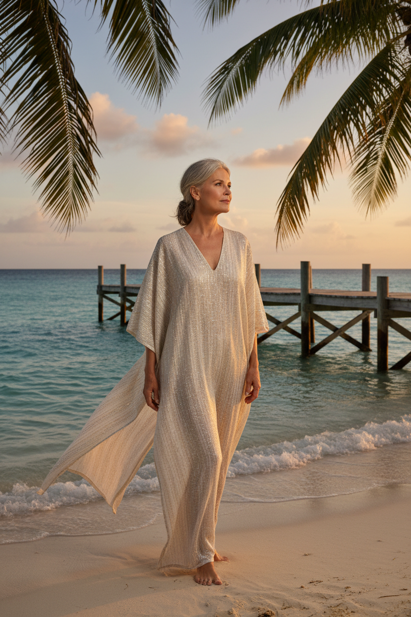 A long silk kaftan feels very breezy and fancy. It flows beautifully as you walk along the shore. Pair it with flat leather sandals for a relaxed yet high end look. The vibrant colors make it a standout choice for tropical destinations.