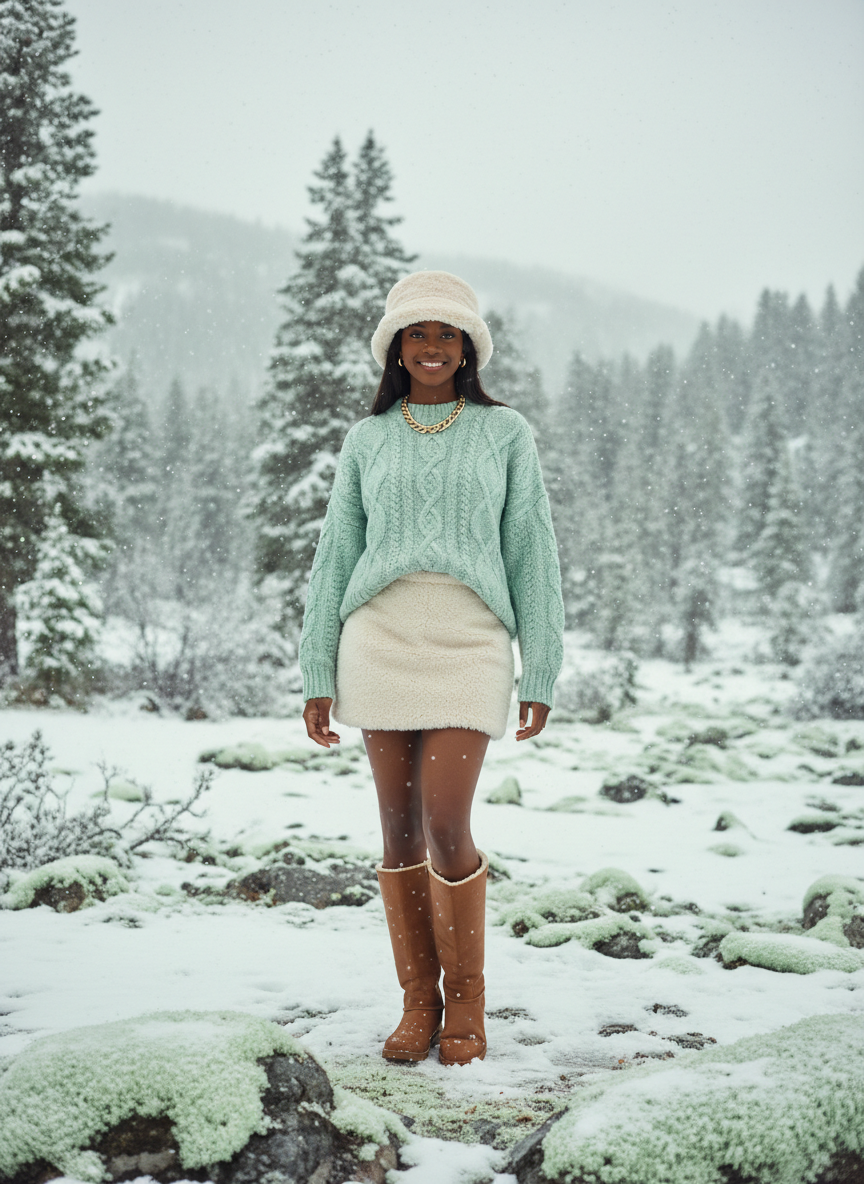 Accessories can totally change your winter game. Wear a fluffy faux fur bucket hat to keep your head warm and look iconic. Pair this with a plaid mini skirt and thick fleece-lined tights. The tights are the secret weapon here because they let you wear skirts without freezing.
