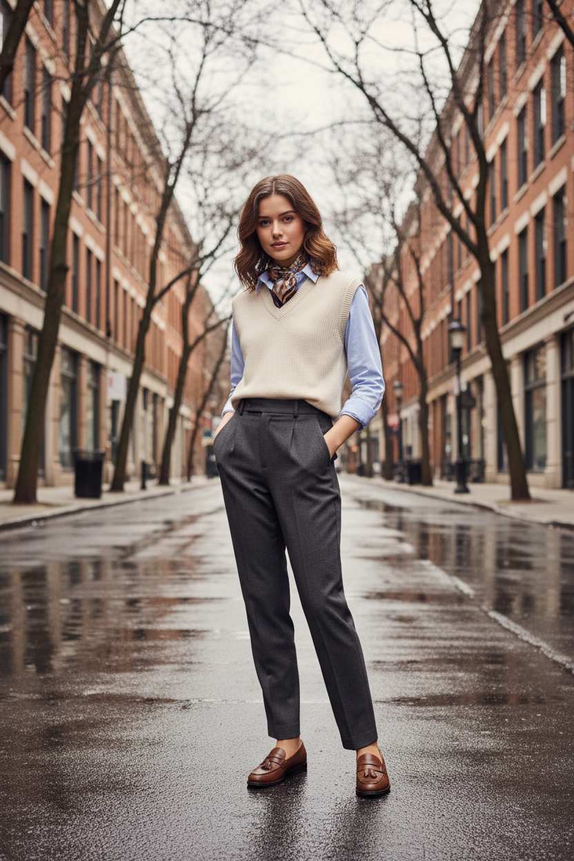 Vests are perfect for layering when the office AC is unpredictable. Wear one over a basic long sleeve shirt for a preppy vibe. It adds a layer of warmth without the bulk of a full sweater. This look is trendy and feels very cozy for a rainy Tuesday.