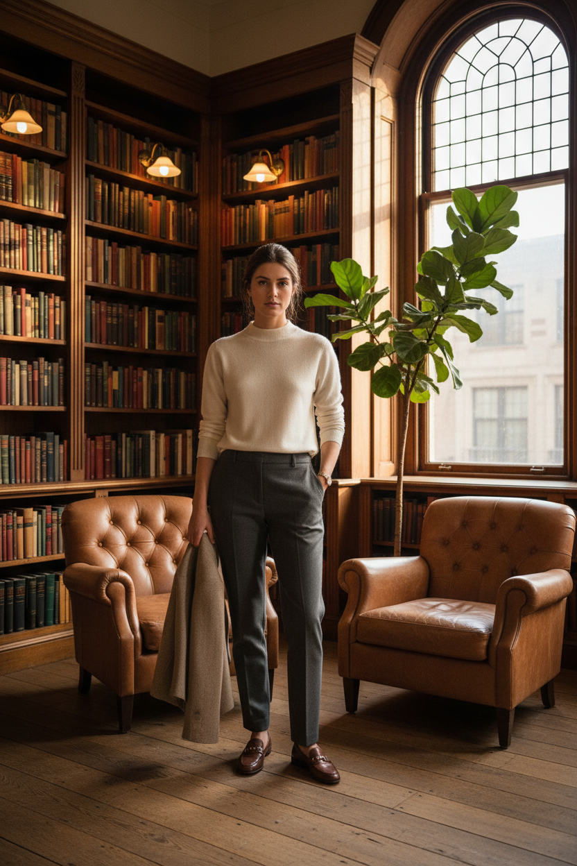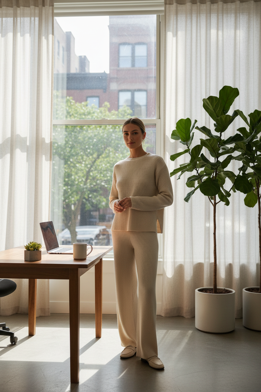 It is time to embrace soft knits and stretchy trousers. These looks work for meetings or coffee runs. Check out these cozy styles for your work week. Save these ideas to Pinterest now.