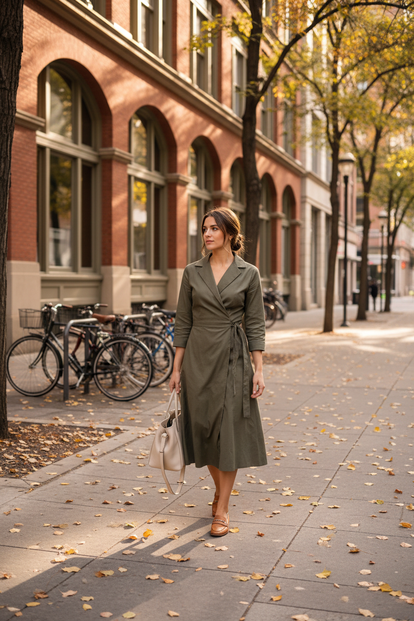 Wrap dresses are iconic for a reason. They fit every body type and let you adjust the waist as needed. Cotton fabric stays breathable even during stressful presentations. You just throw it on and you are ready for the day.