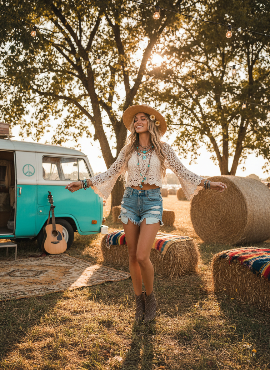 This is the ultimate option for a hot summer festival. A bandana top is lightweight and fits the country theme perfectly without feeling like a costume. The pattern is iconic and instantly recognizable among other fans. You can pair it with high waisted shorts for a balanced silhouette. It feels youthful and fun for an outdoor concert.