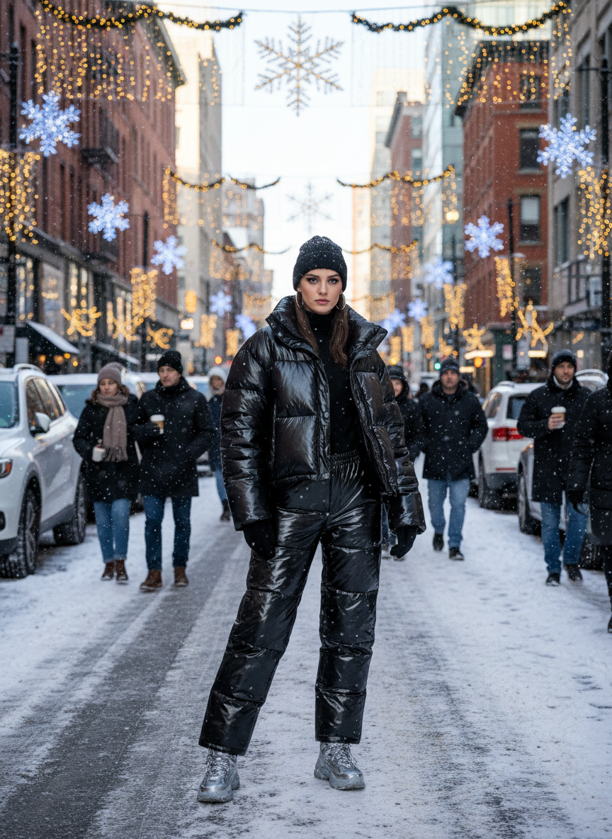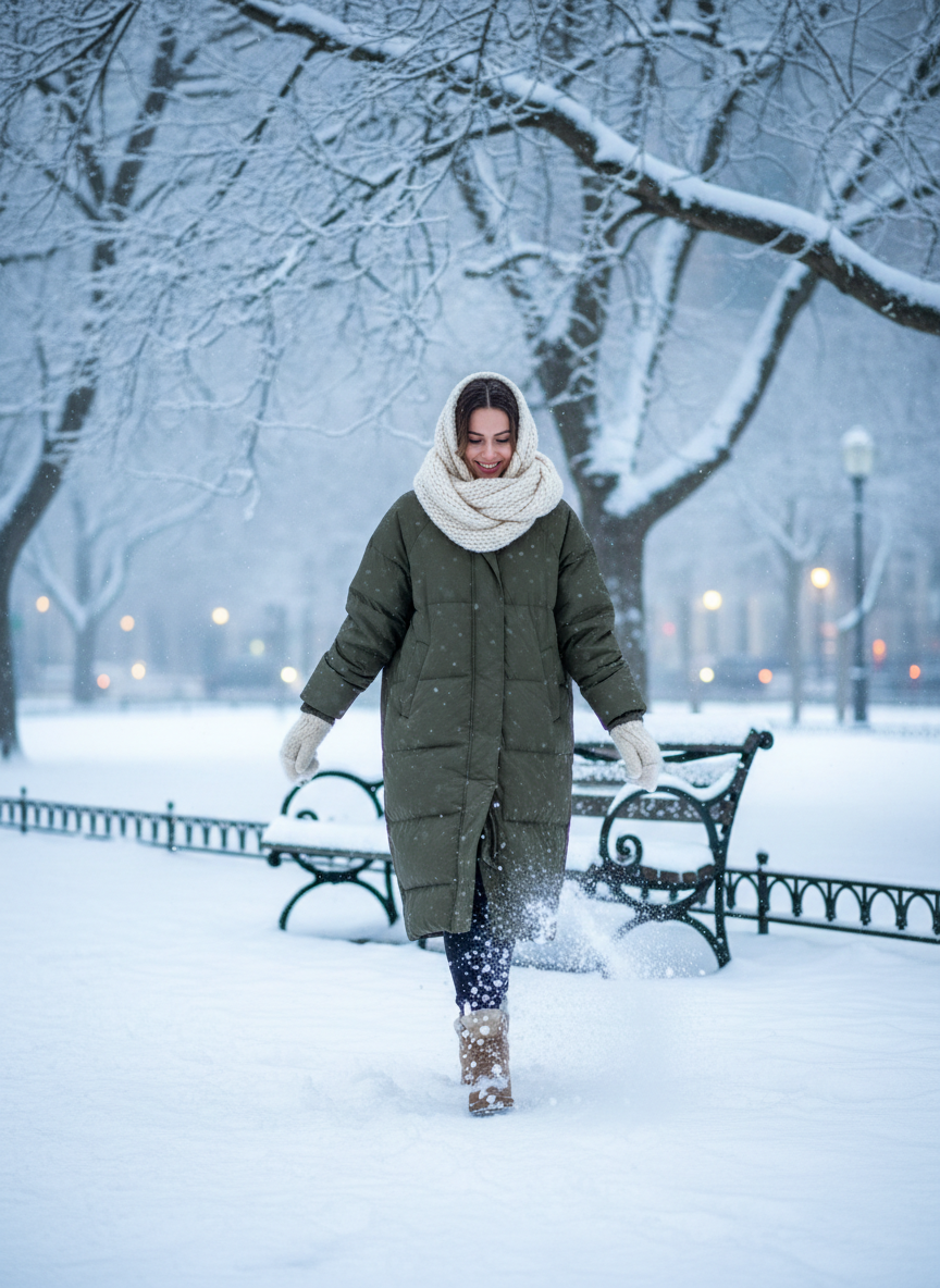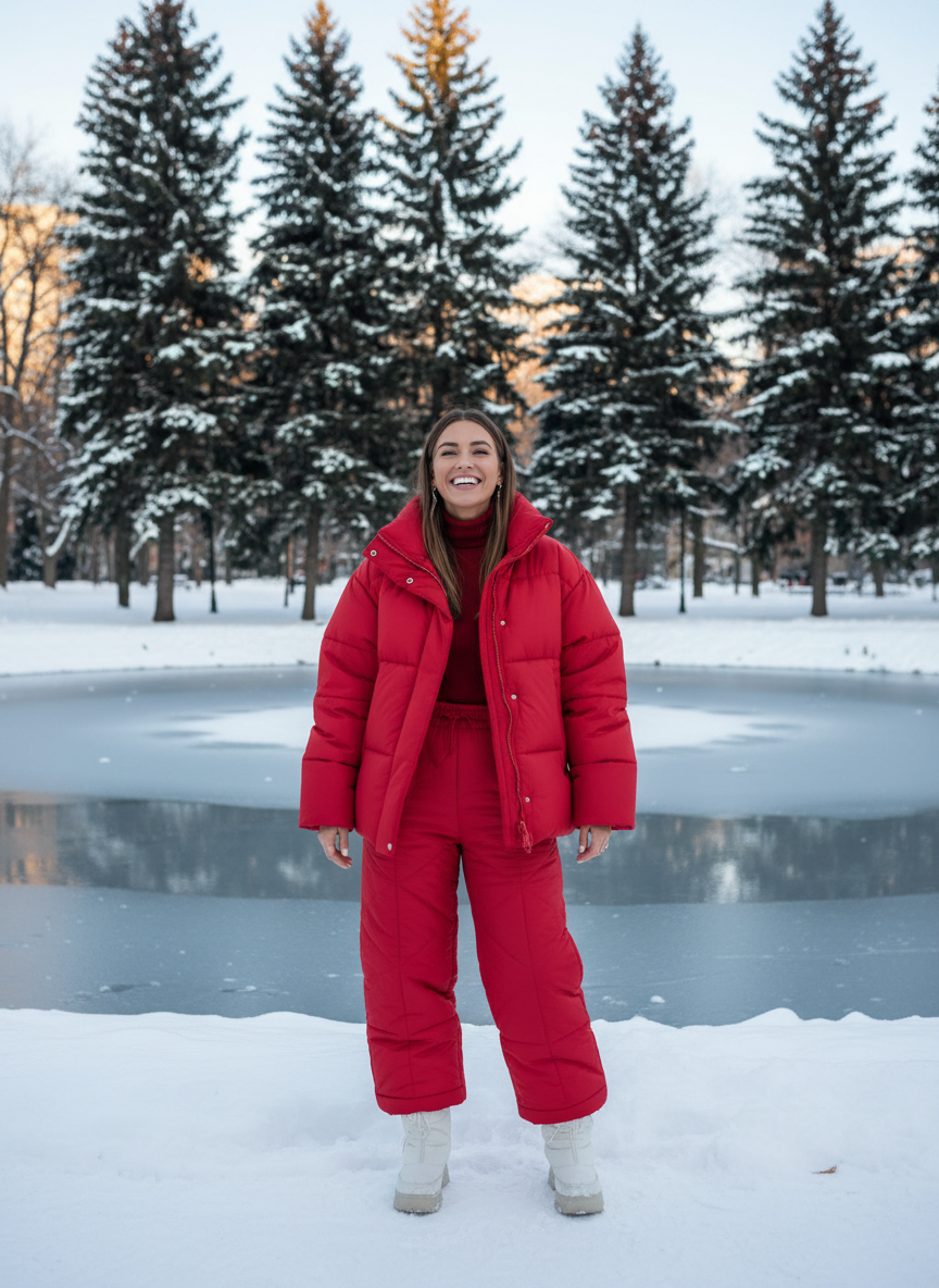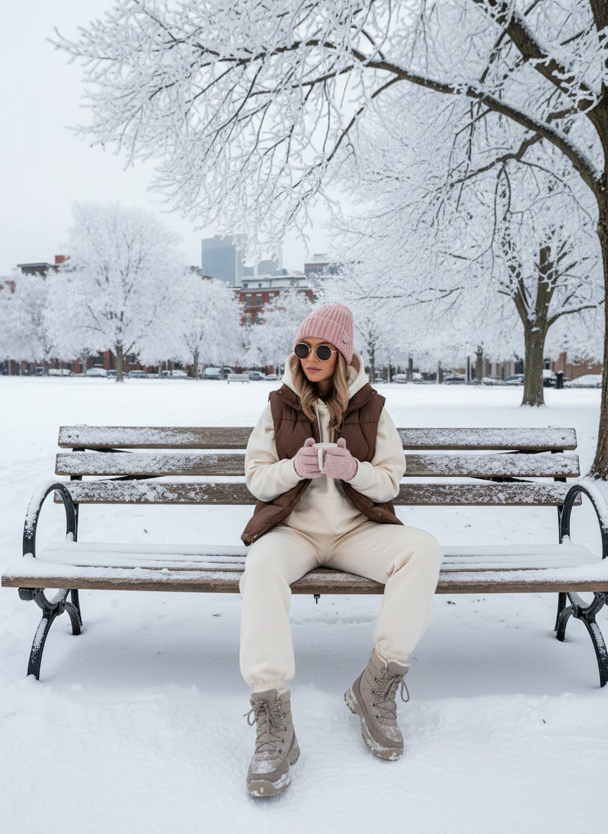 Wearing all white when it snows is a major power move. A crisp white puffer jacket paired with matching white pants makes you look like a chic snow angel. You can break up the texture by wearing a fuzzy beanie or scarf in a cream shade.