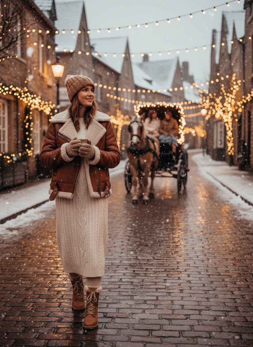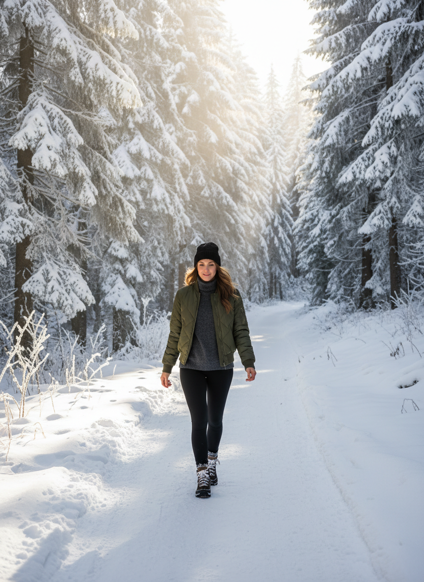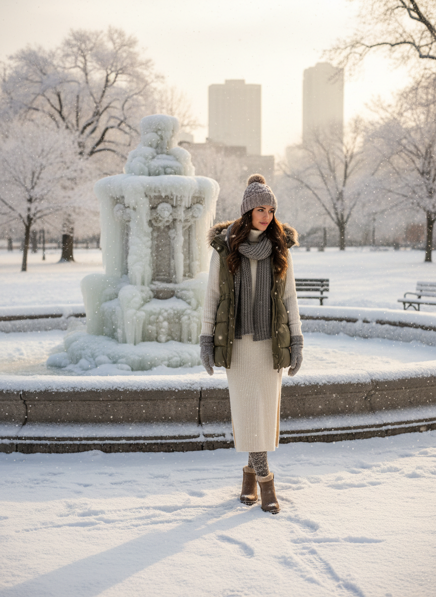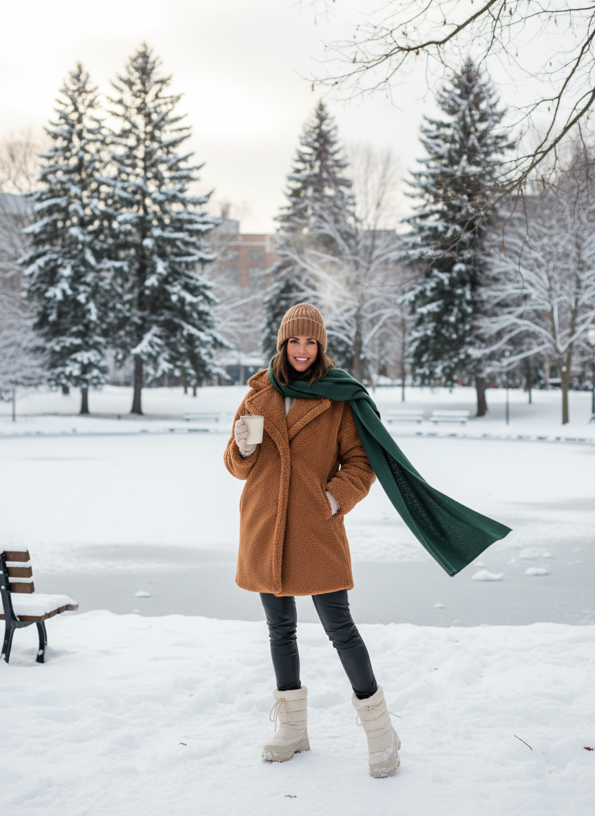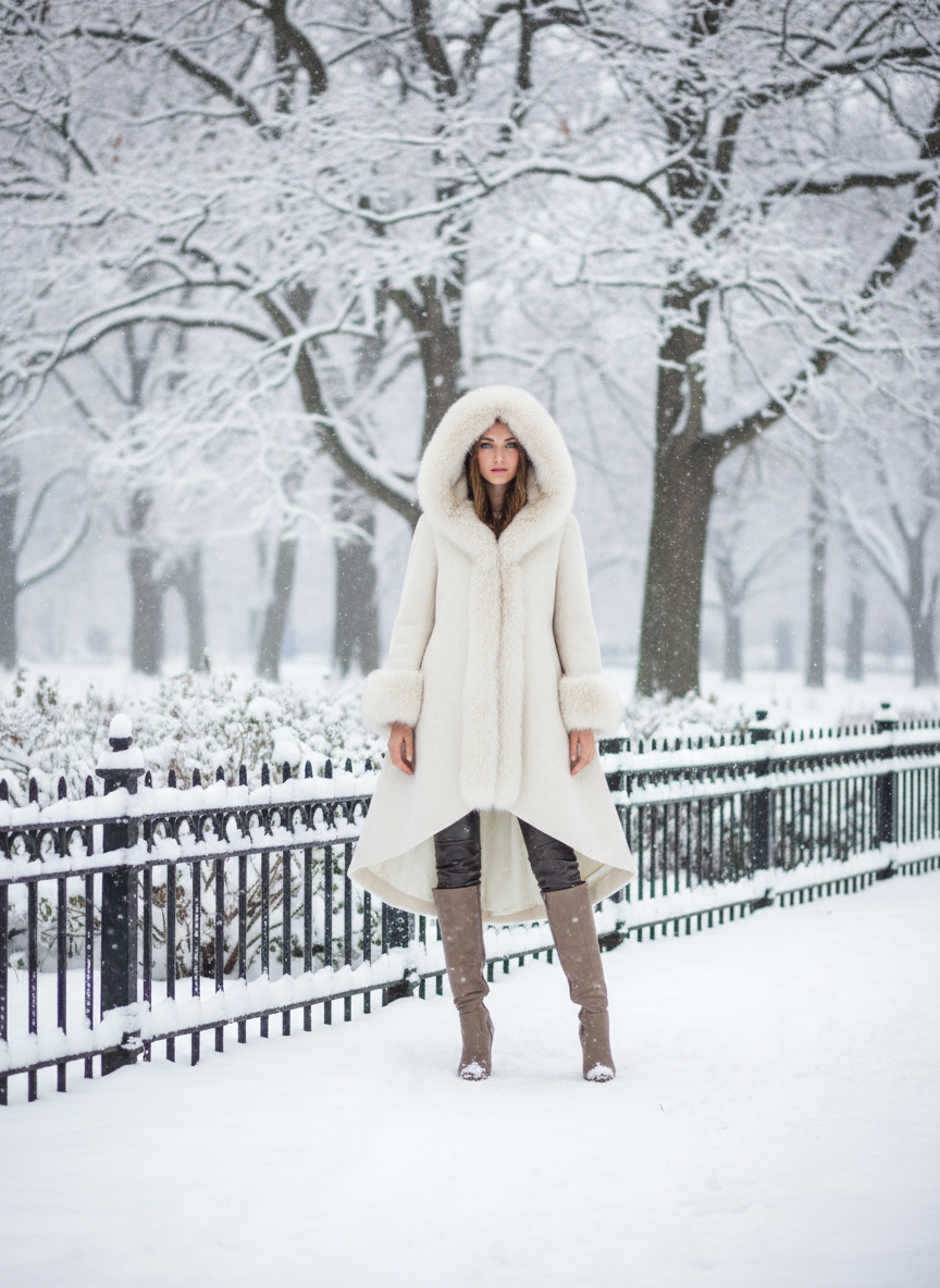 Wearing all white when it snows is a major power move. A crisp white puffer jacket paired with matching white pants makes you look like a chic snow angel. You can break up the texture by wearing a fuzzy beanie or scarf in a cream shade.