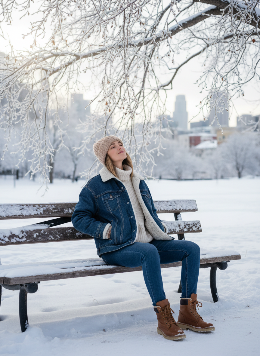 Denim creates a cool casual vibe but you need insulation. A sherpa lined denim jacket gives you that blue jean look with necessary warmth. Layer it over a thick grey hoodie for a relaxed snow outfit. This creates a cool layered effect around the neckline.