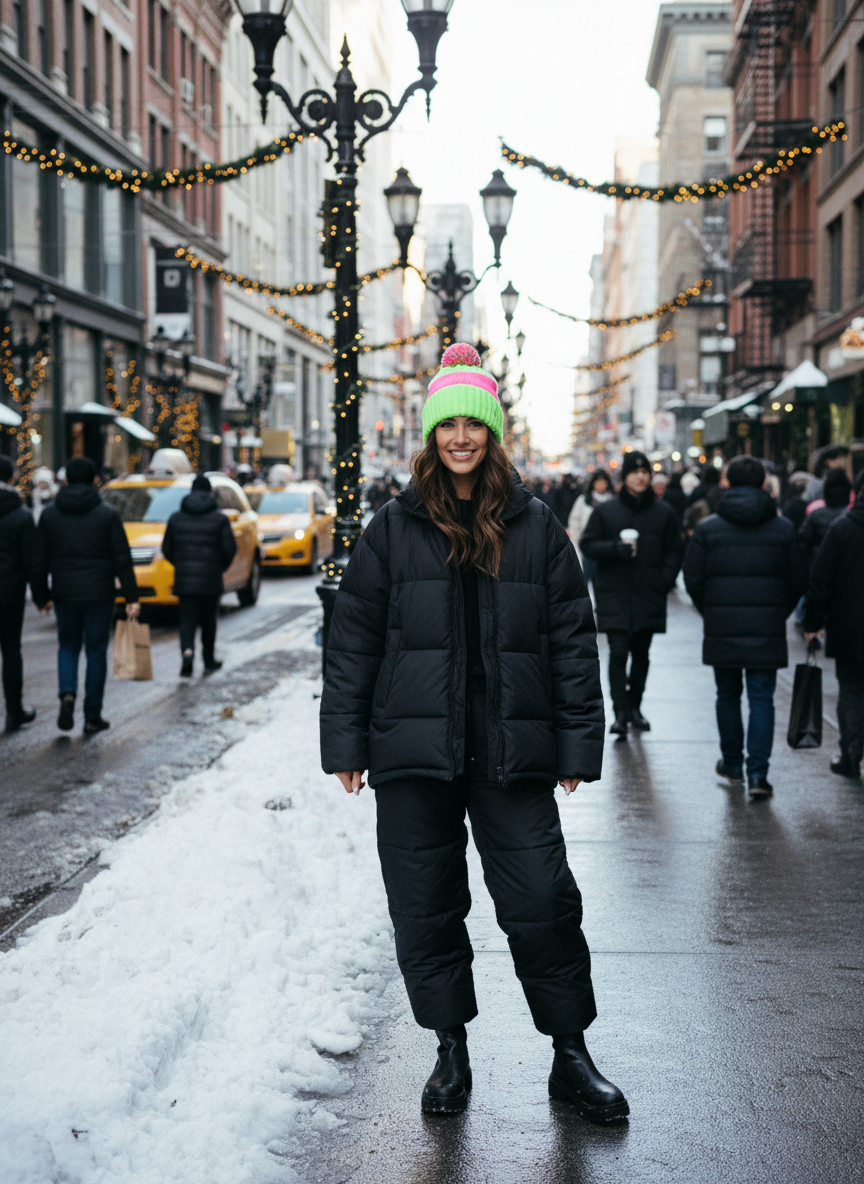 Inject some energy into your wardrobe with neon accessories. Take a standard black puffer jacket outfit and add a lime green or hot pink beanie. It is an easy way to look trendy without buying a whole new coat. This snow outfit feels very street style ready.
