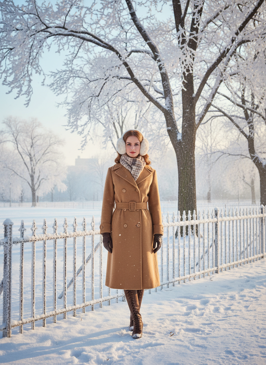 Protect your ears without messing up your hair by choosing ear muffs. They look adorable paired with a structured wool coat. This snow outfit feels very classic and put together. You can match the color of your ear muffs to your boots for coordination.