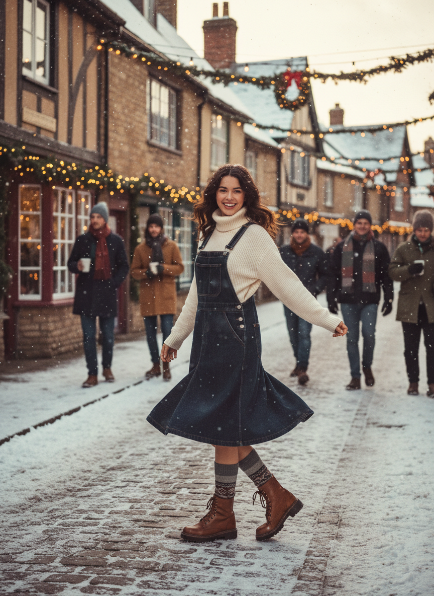 Corduroy overalls are thicker than denim and great for winter. Layer a thick white turtleneck underneath for a playful snow outfit. It feels a bit vintage and very youthful. Add sturdy boots to keep the hem of your overalls dry.