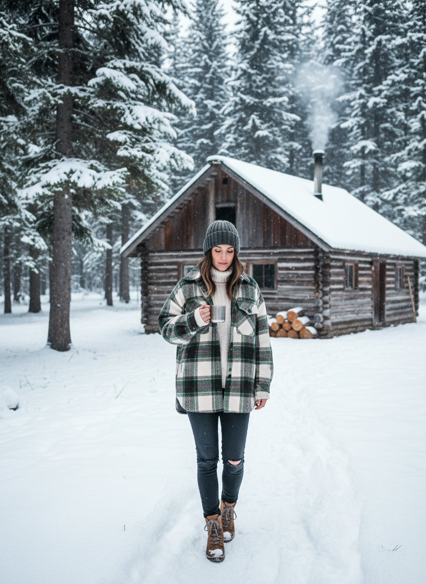 Shackets are thick enough to act as coats on milder winter days. A plaid pattern feels very seasonal and rustic. Wear a matching beanie to pull the whole snow outfit together. It gives off a cozy cabin in the woods vibe.