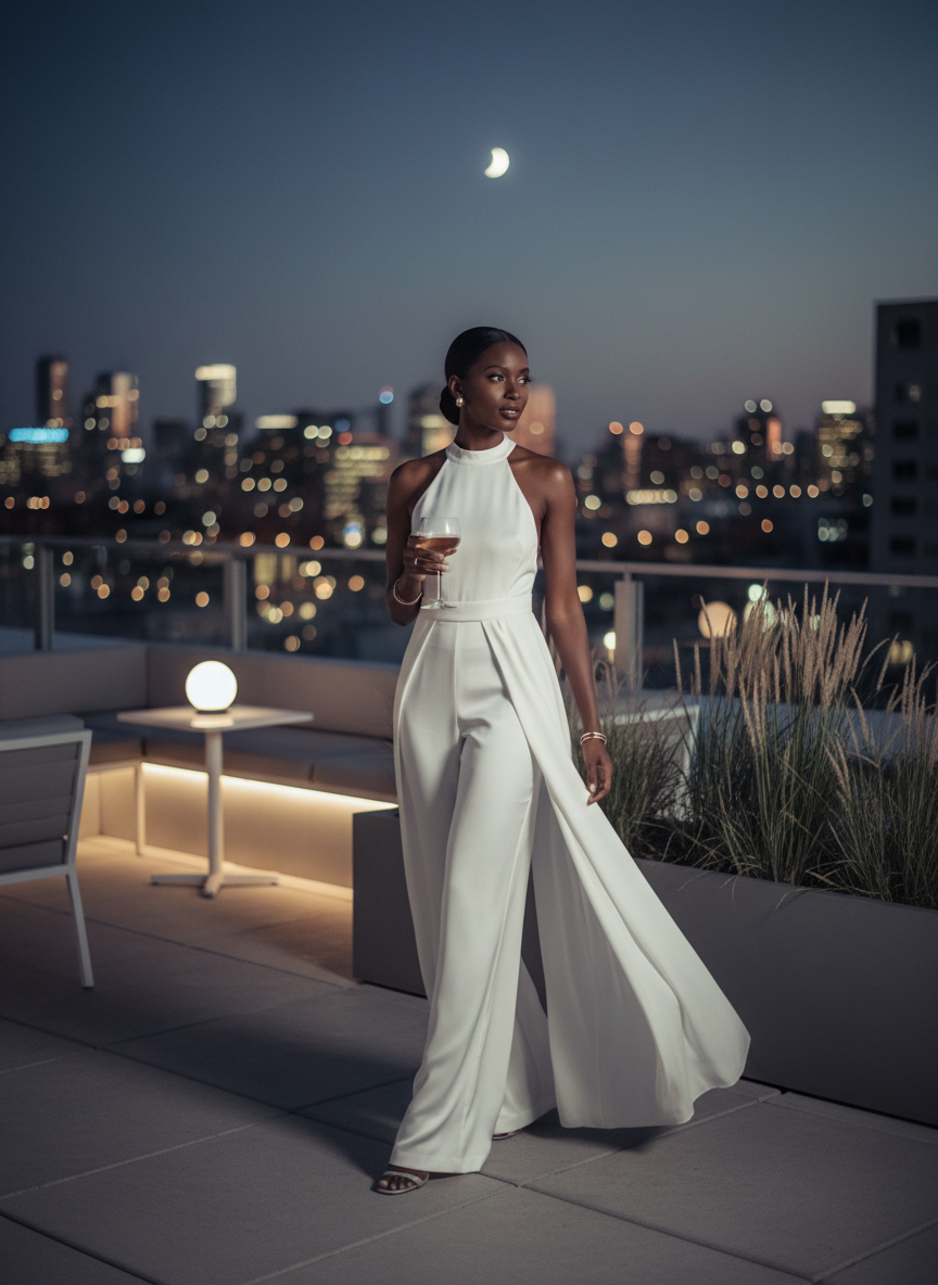 Wearing all white is a massive power move that screams elegance. A crisp white jumpsuit offers a sleek and modern vibe that stands out in a dimly lit restaurant or bar. The wide-leg cut adds some drama to your walk and makes your legs look miles long. Keep your makeup dewy and fresh to match the clean aesthetic of the outfit.