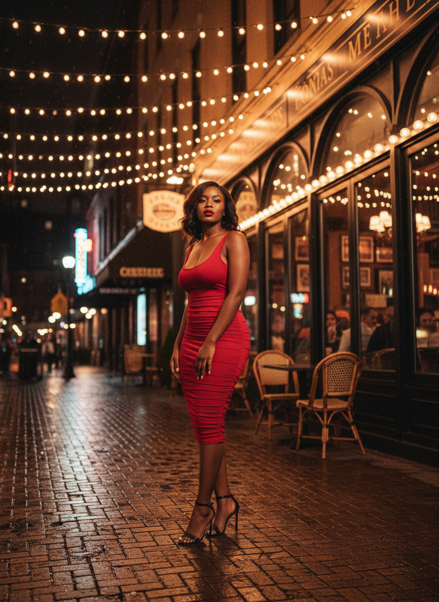 A mini cut makes this feel flirty and youthful. It is one of those stunning date night outfits for Black women that feels festive and romantic all at once.