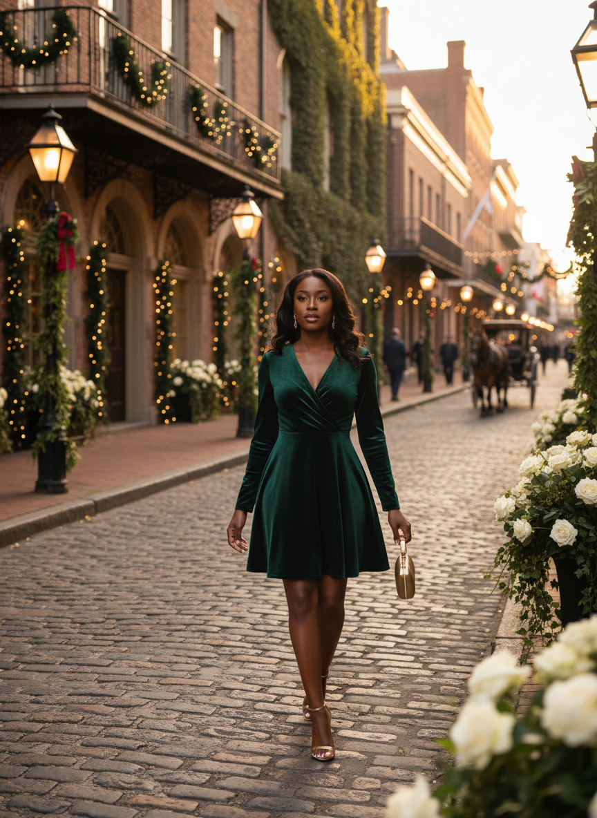 Velvet is such a luxe fabric that feels amazing to wear. An emerald green shade looks royal and rich against deep skin tones. The texture catches the light in a really subtle way that adds depth to your pictures. Keep your hair sleek and straight or in a high bun to show off your neckline.
