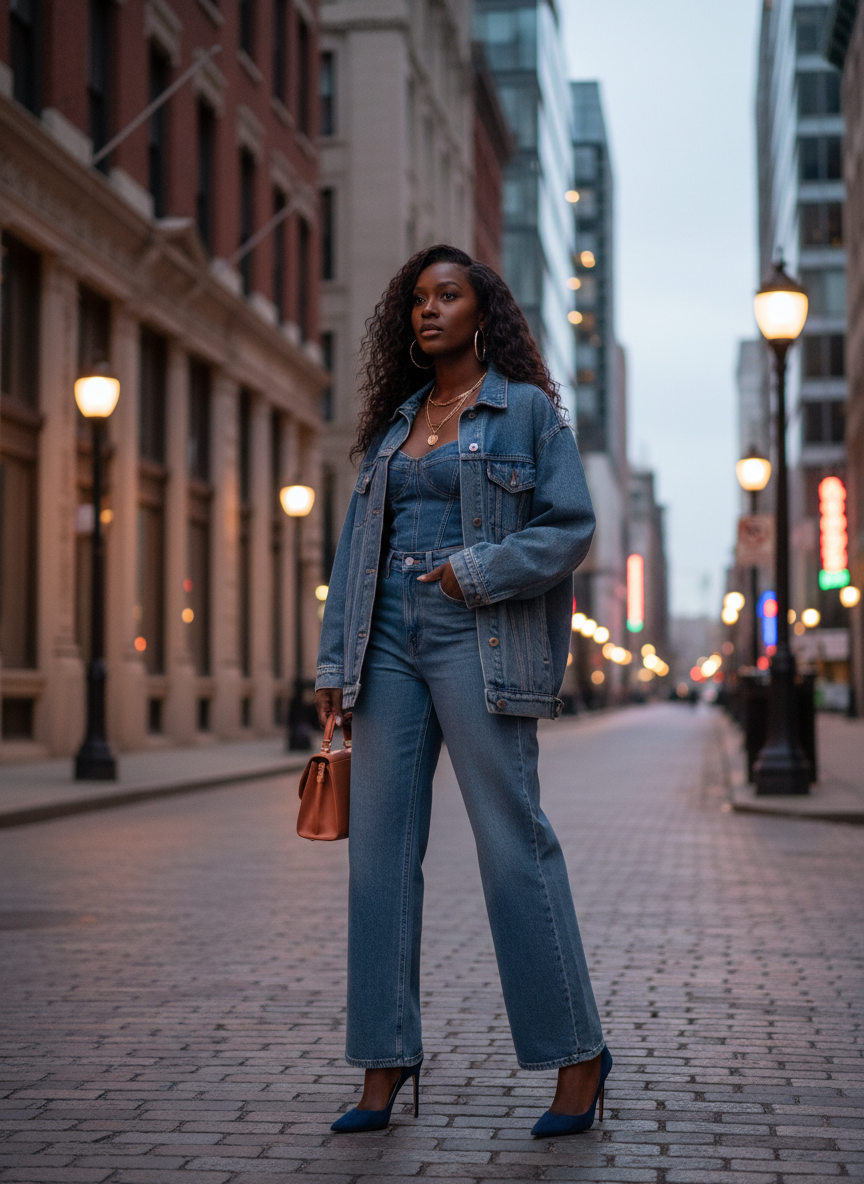 Do not underestimate the power of a well-styled Canadian tuxedo. A fitted denim corset or shirt tucked into matching jeans creates a seamless line that looks so chic. The key to making this work for a date is adding glam accessories like sparkly heels and a statement bag.