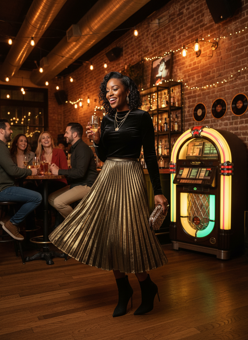 Shimmering gold fabric against brown skin is a match made in heaven. A pleated metallic skirt moves with you and catches every single light in the room. You can tone it down with a simple black bodysuit or go full glam with a matching metallic top. This outfit is fun and perfect for dancing or a celebration. It feels festive and special without being a full gown. You will literally sparkle all night long.