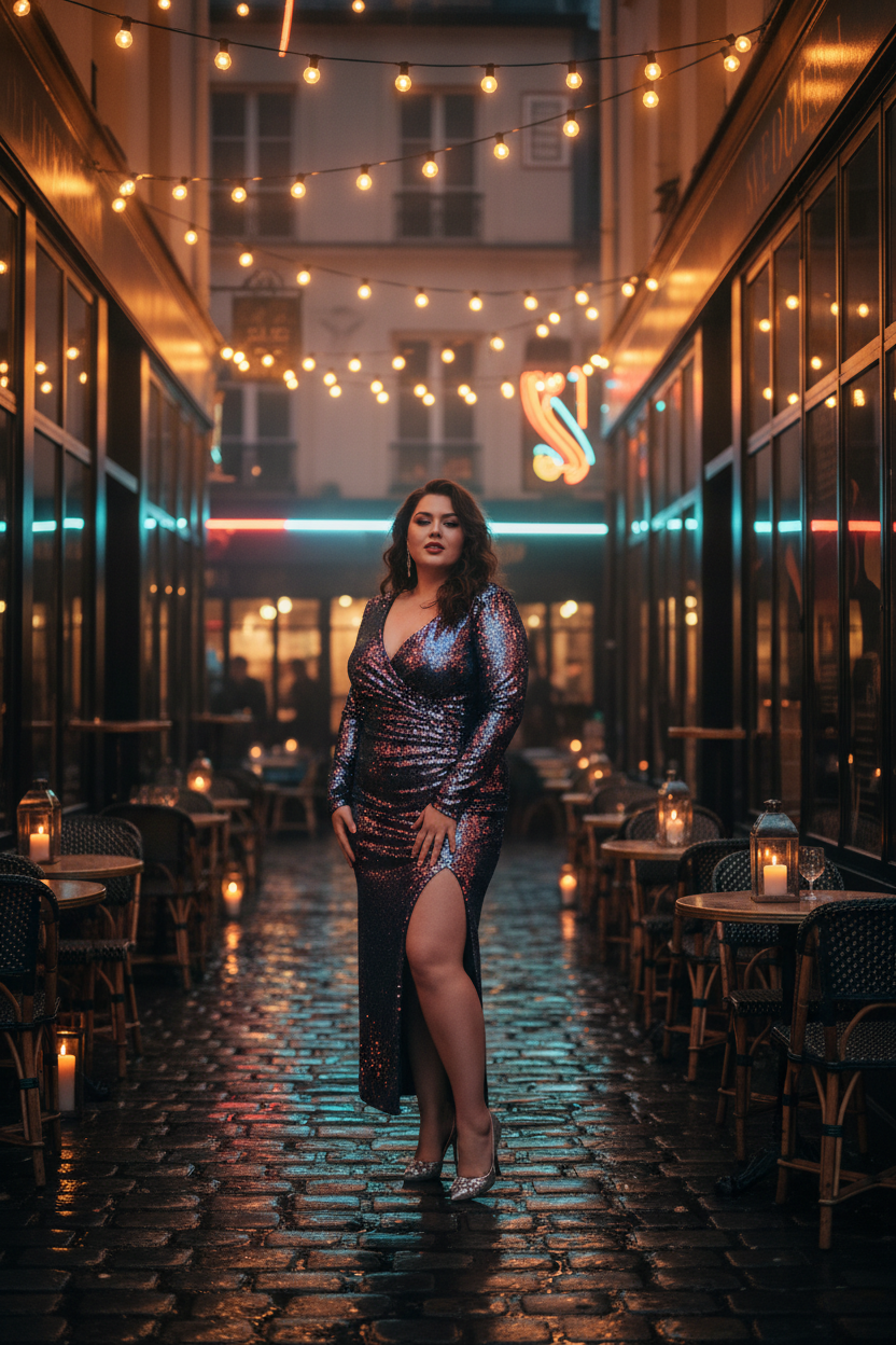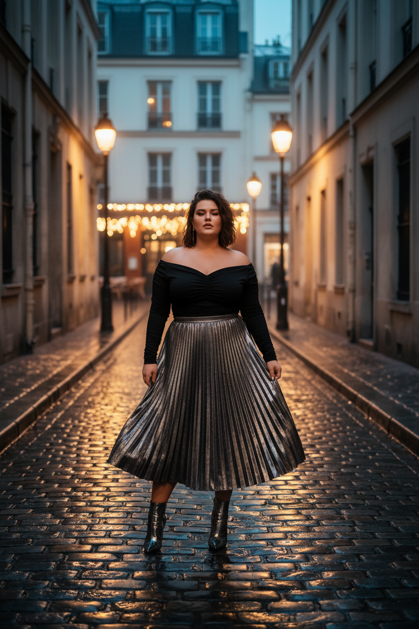 If you want to sparkle, a sequin skirt is the way to go. This curvy date night outfit is loud and fun in all the right ways. Balance the shimmer with a simple white tee or a black turtleneck. It is a perfect outfit for a celebration or a party date.