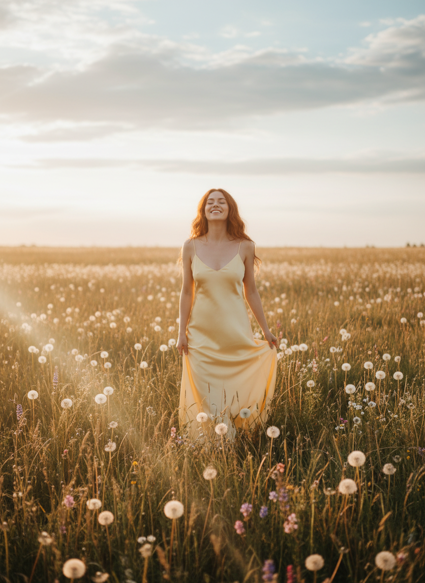 Nothing matches the cheerful vibe of a blooming meadow quite like a soft yellow dress. The silky fabric catches the natural light so beautifully and moves nicely in the wind. This look is simple but completely stunning for golden hour pictures.