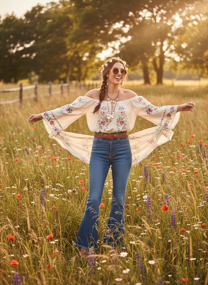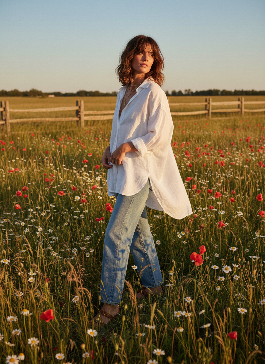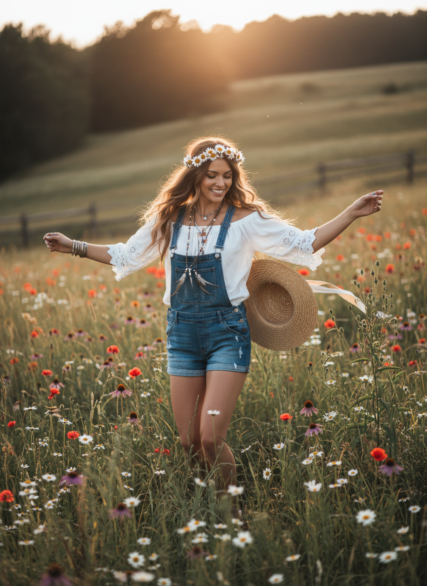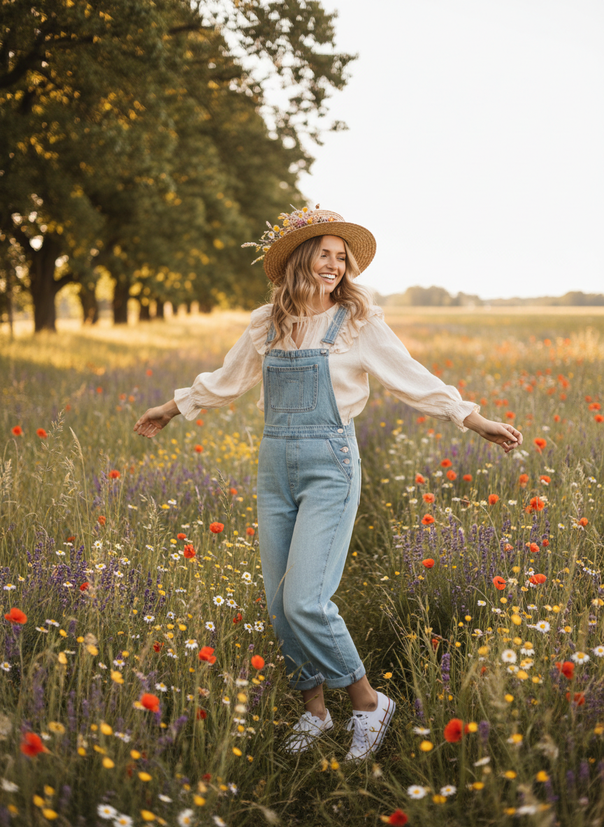 Overalls are incredibly cute and practical for wandering through tall grass. Throw them on over a simple white tee or a pastel tank top for a relaxed aesthetic.