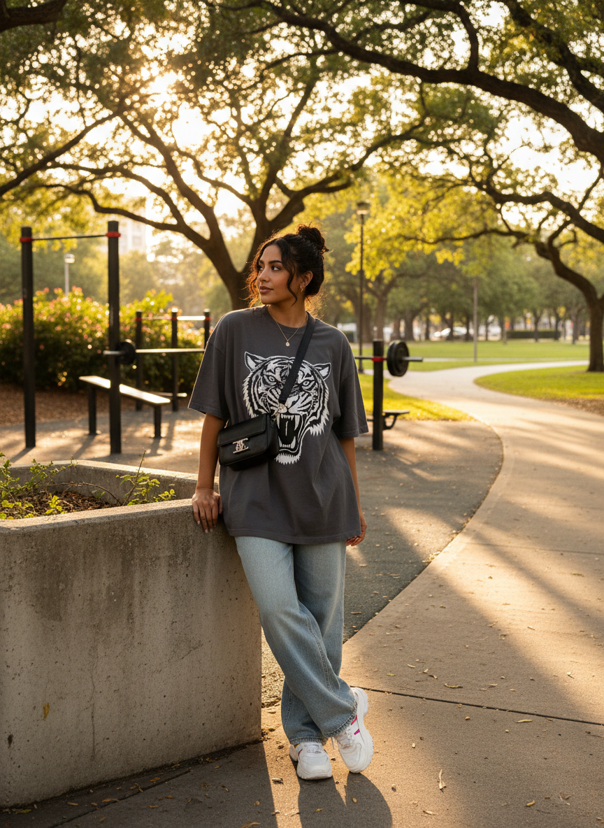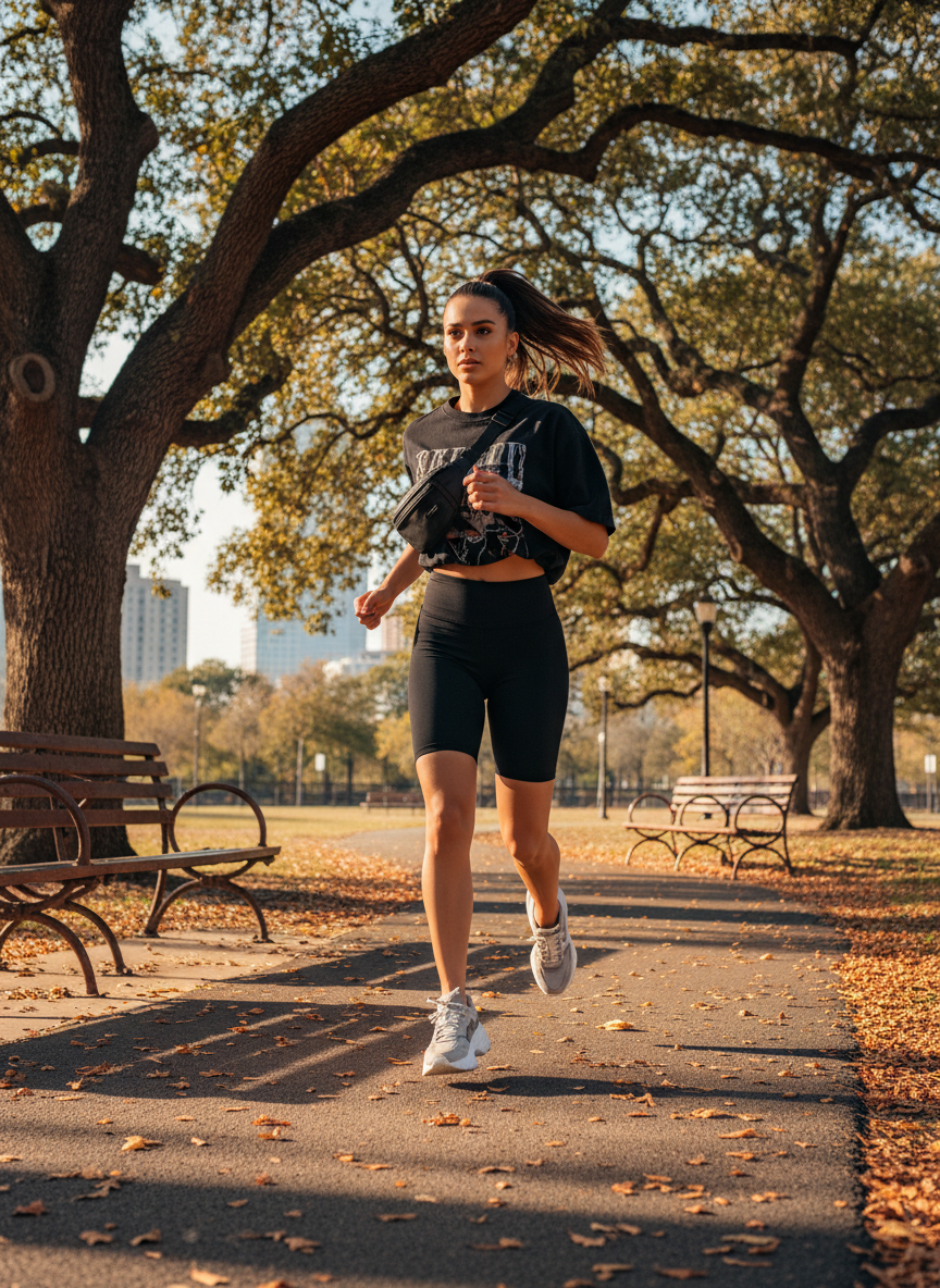 The pump cover look is trending everywhere right now. An oversized graphic tee gives you plenty of room to move during upper body days. You can tuck it into your sports bra for a cropped look or leave it loose. This style looks effortlessly cool and relaxed.
