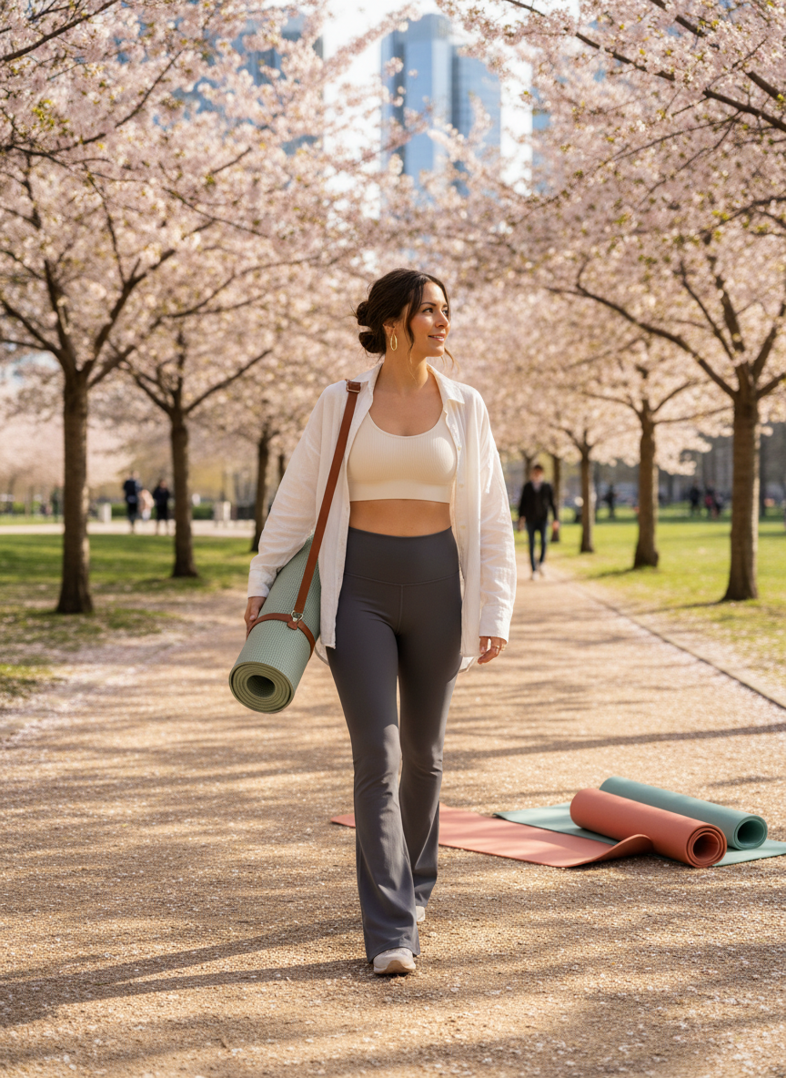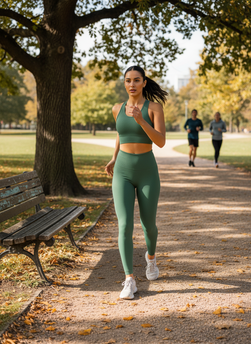 A monochromatic ribbed set instantly makes you look put together. The texture adds a nice detail without being too loud. You can find these in neutral tones like beige or sage green. It feels super soft against your skin while you stretch.
