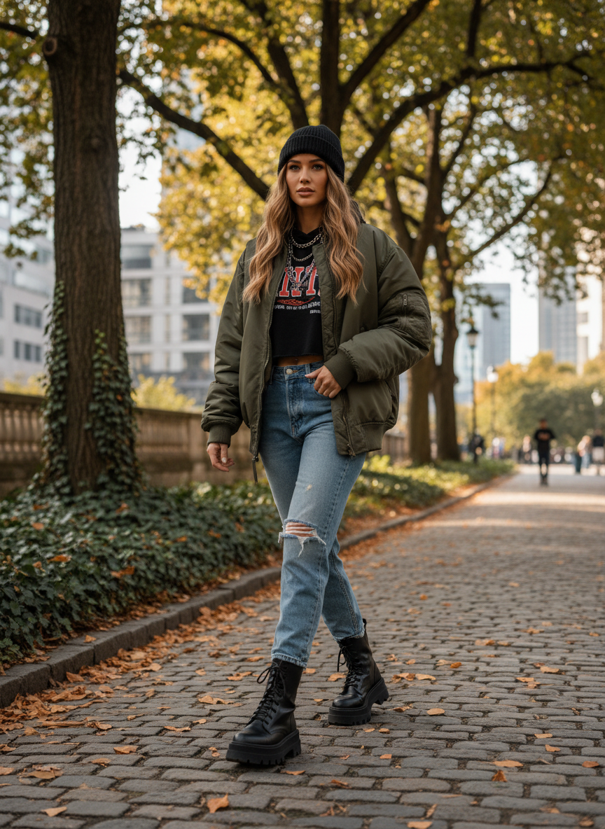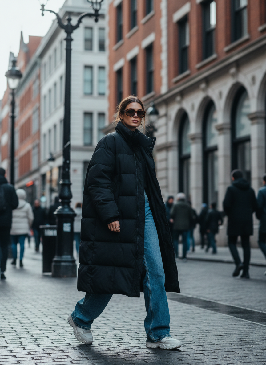 You can tuck a fitted top in to define your waist. The contrast between the rigid denim and the puffy fabric looks amazing. It stops the outfit from looking too messy.