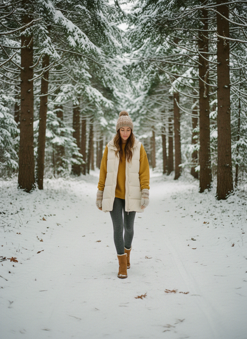 Sometimes comfort is the only thing that matters. Pair your long puffer vest with cozy sherpa lined boots. This is the ultimate winter uniform for snowy days. Keep the rest of the outfit simple with leggings and a fleece sweater. You will feel like you are walking on clouds while staying super warm.