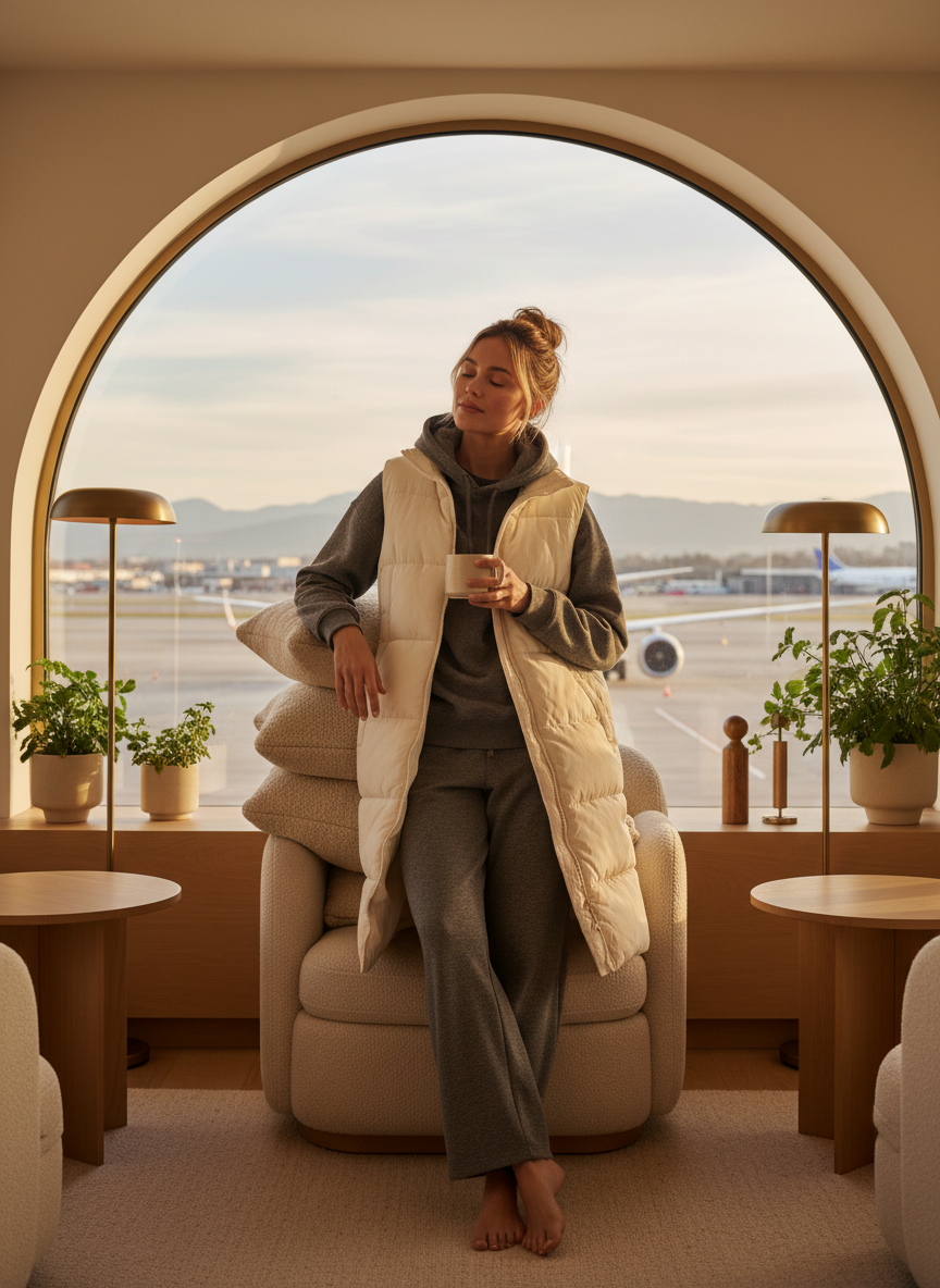 Coordinate a matching sweatpant and sweatshirt set in a pastel color. Throw a white or cream long vest over the top to keep the palette soft. This is the ultimate comfort outfit for travel or studying.