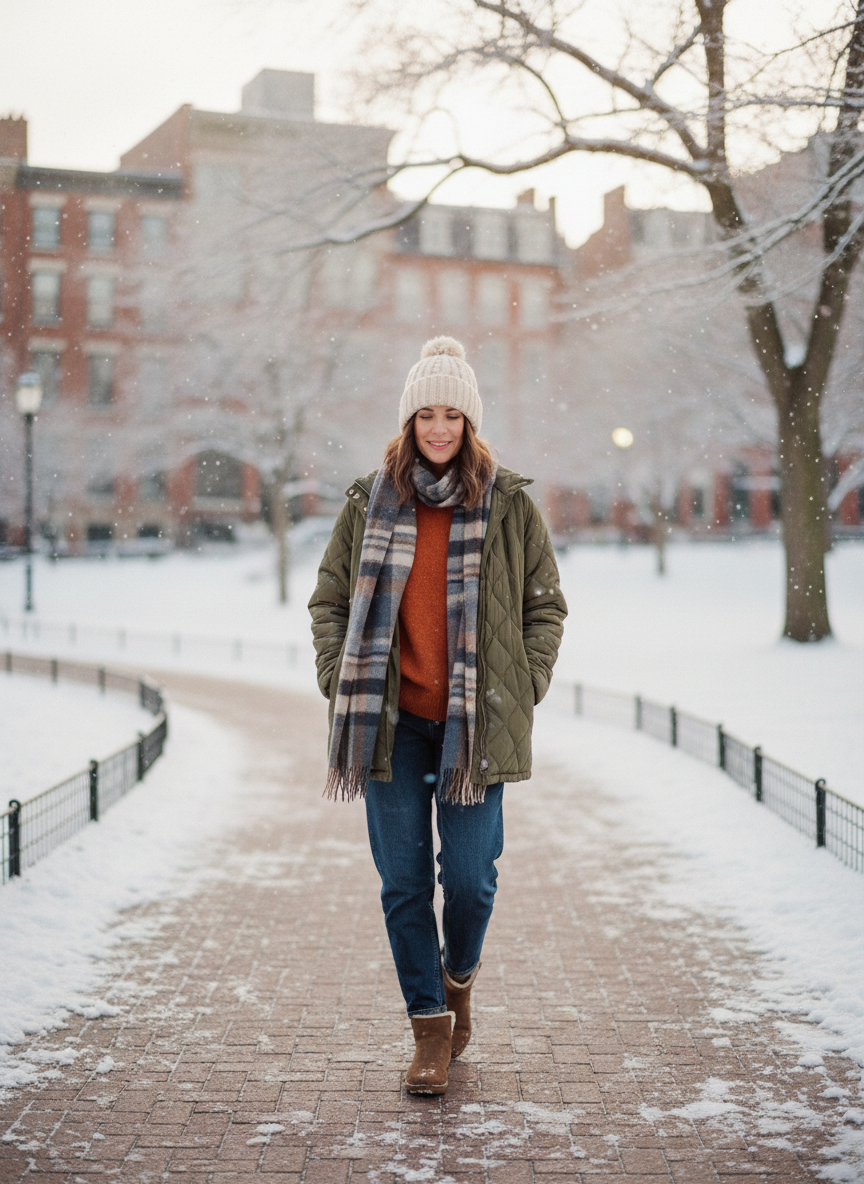 Accessories make a huge difference in winter styling. A thick knit beanie balances the bulk of a large coat. This pairing keeps heat locked in from head to toe. It gives off major cozy vibes for chilly mornings. You can match the hat color to your boots for cohesion.