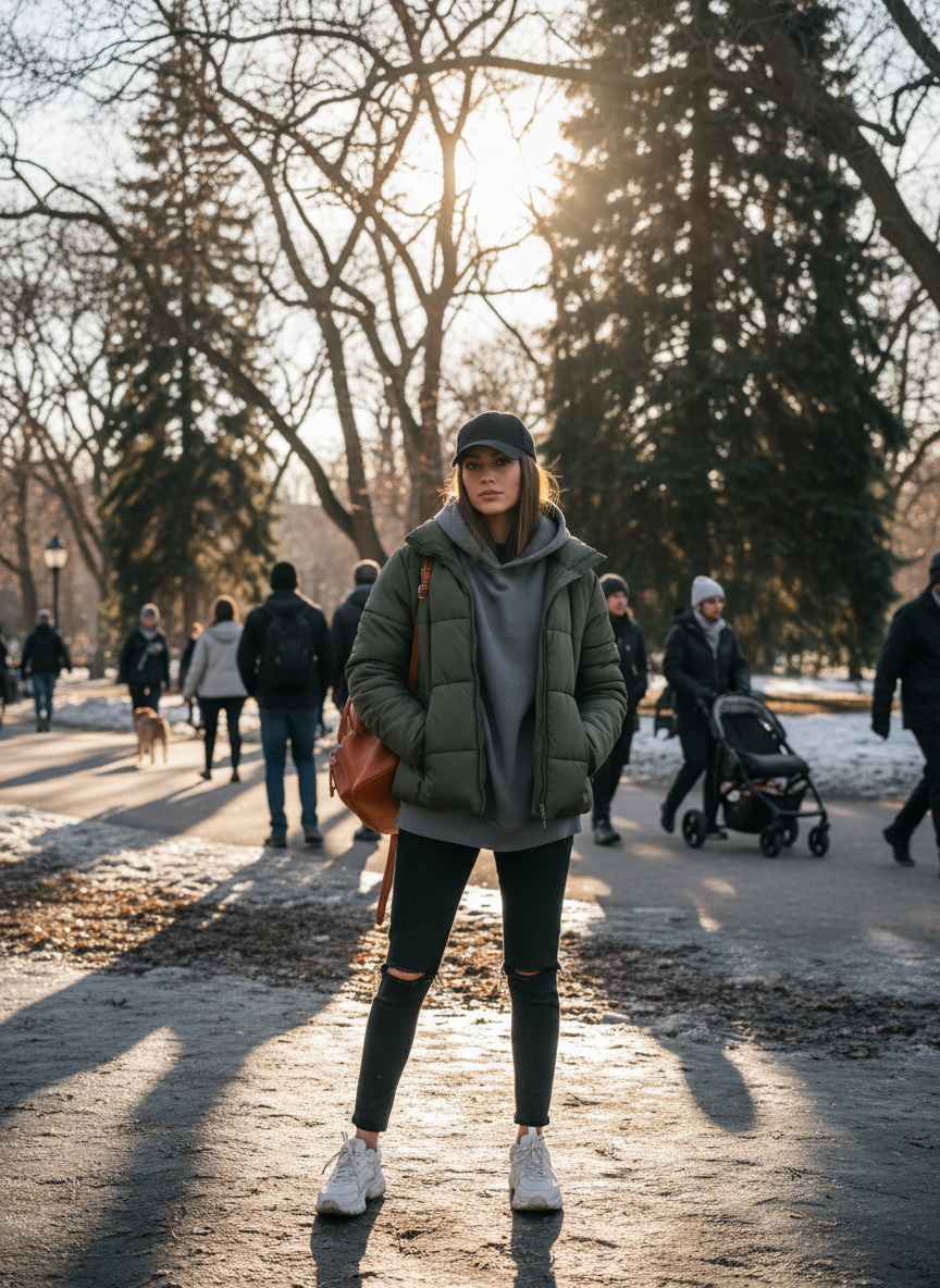 Sporty vibes are always in style. A simple cap adds a casual touch to the big jacket. It works great for bad hair days or gym runs. The brim creates a nice shape near your face. It keeps the sun out of your eyes on bright winter days.