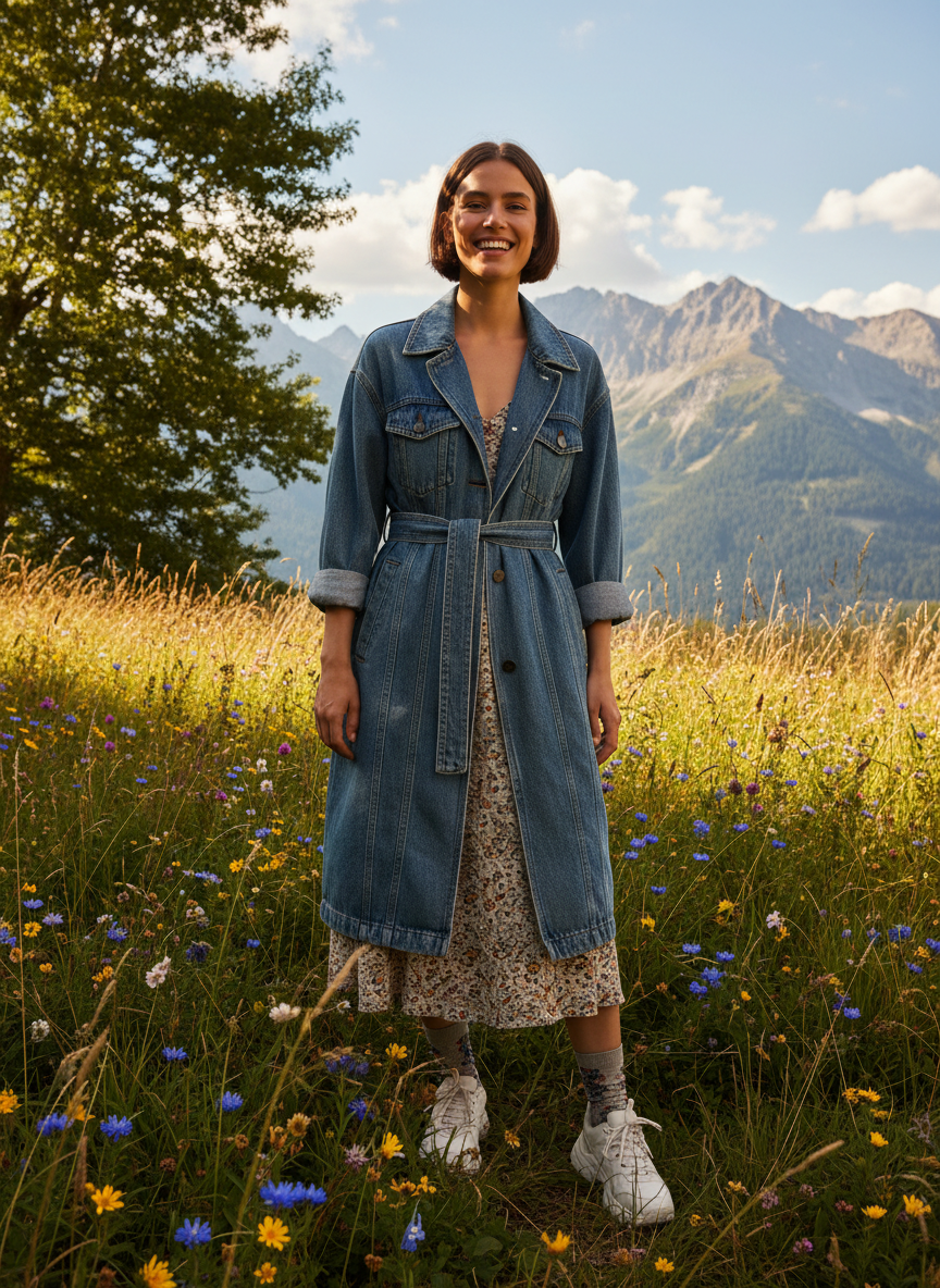 Denim isn't just for your jeans anymore. A long denim trench coat offers a cool street style aesthetic. The structure of denim holds its shape really well. Use the belt to snatch your waist and create an hourglass figure. It works surprisingly well as a neutral layer over colorful outfits.