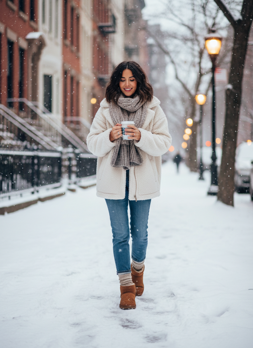 Comfort is everything when you are walking ten thousand steps a day. A cozy sherpa jacket feels like a hug and looks adorable with leggings. You need mini platform boots to keep your feet warm against the concrete. Add some thick white socks that scrunch down for extra texture.