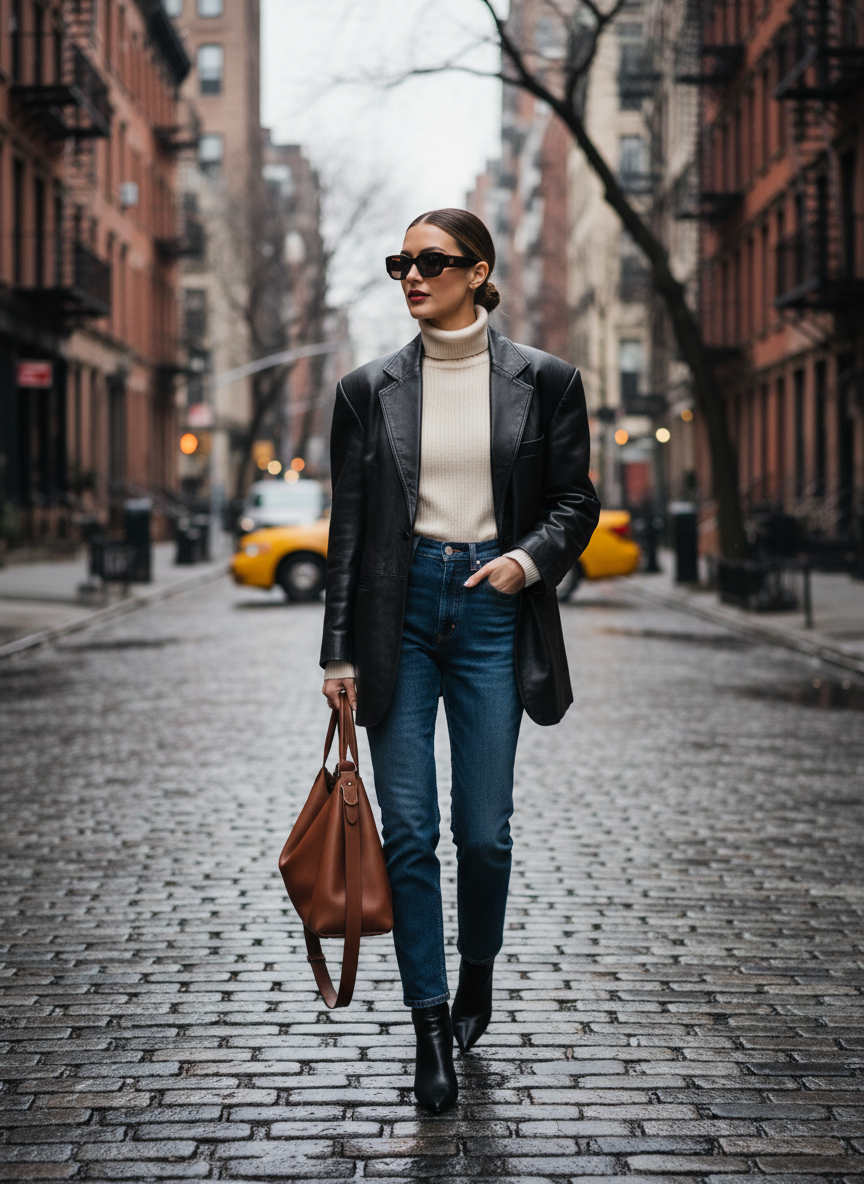 An oversized leather blazer gives off major 90s vibes. Layer it over a fitted black turtleneck for a sleek profile that works day or night. This outfit transitions perfectly from office hours to happy hour drinks. Add some gold hoop earrings and straight-leg jeans to complete the fit. It is polished but still has that cool city edge.