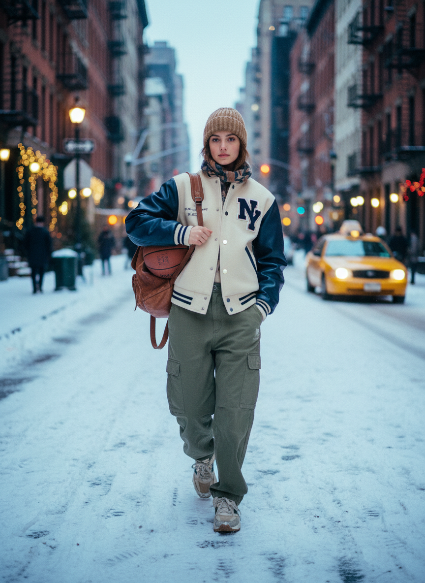 Vintage sport vibes are huge in the city right now. Find a cool letterman jacket and wear it with wide-leg cargo pants. This outfit is super comfy and has plenty of pockets for your phone and metro card. It captures that youthful energy perfectly while keeping you covered up.