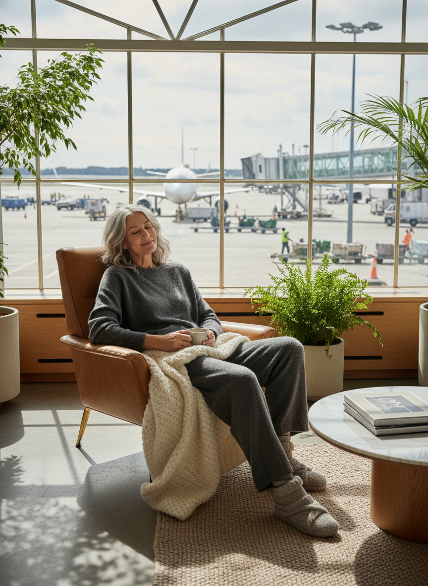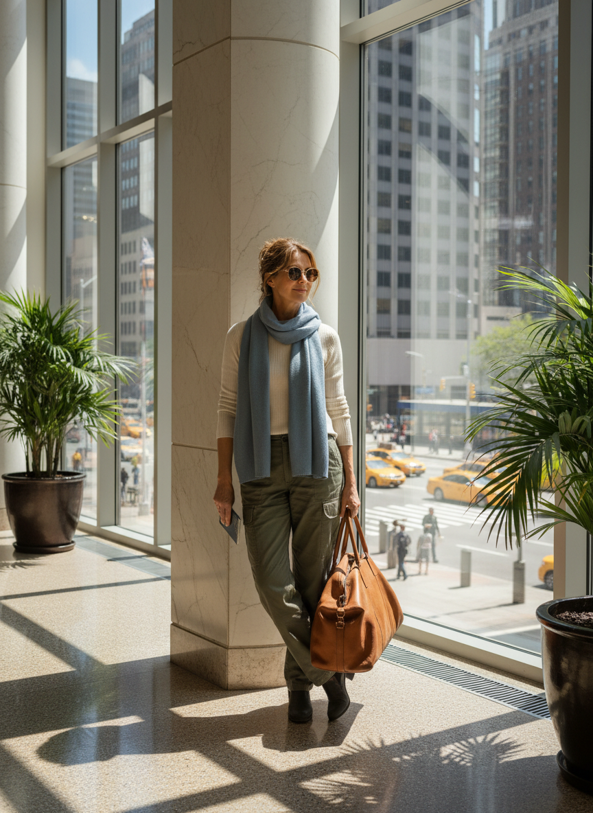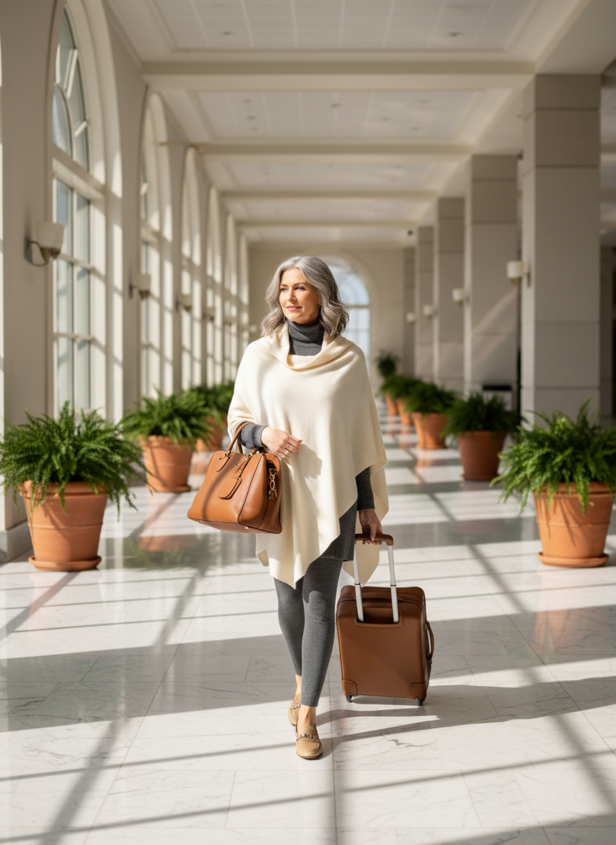 High quality leggings are a travel staple for a reason. Pairing them with a beautiful oversized cashmere wrap takes the look to the next level. The wrap acts like a stylish blanket on the cold airplane. A simple tunic top underneath keeps everything looking refined and graceful.