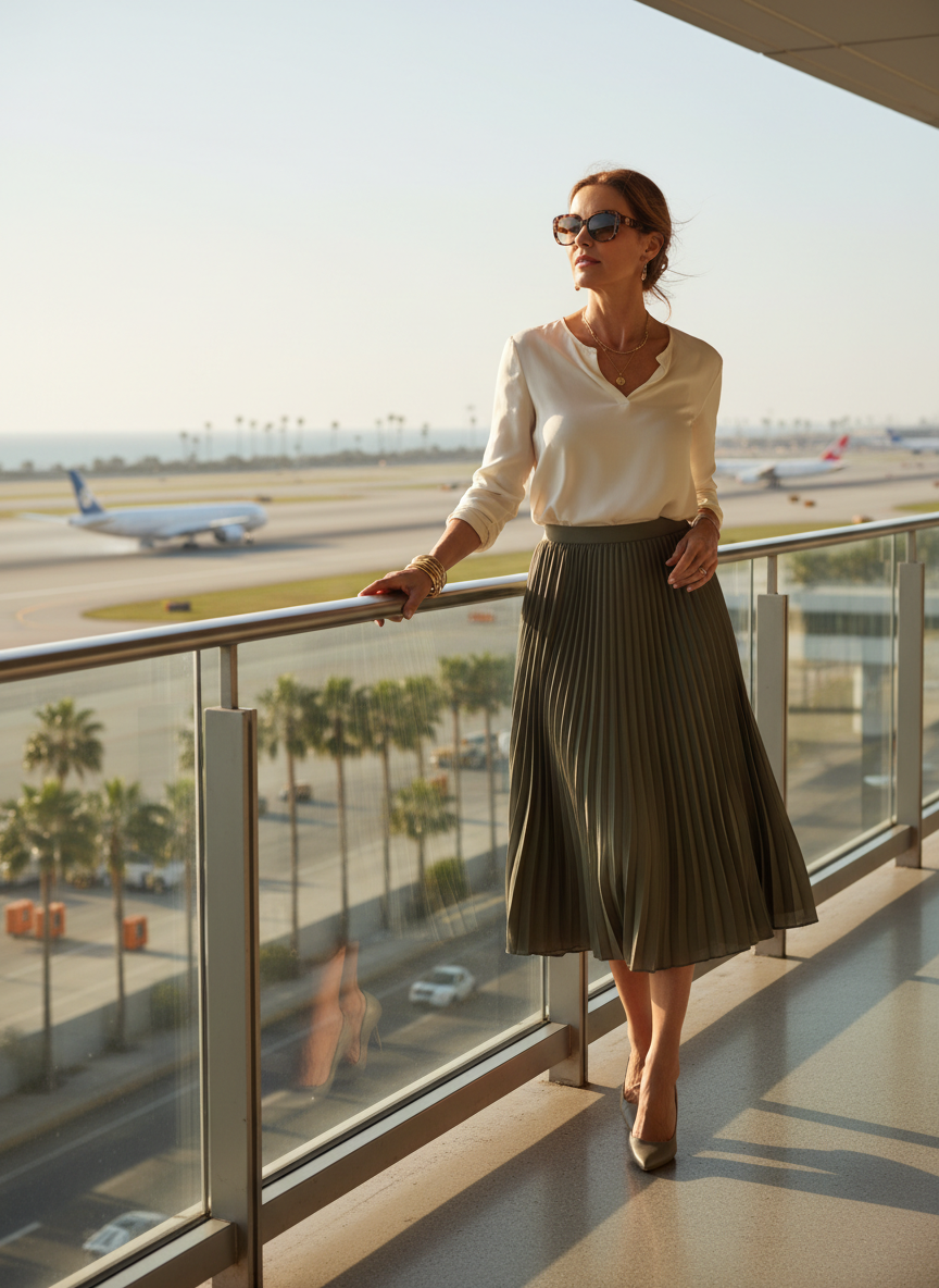 Pleats add gorgeous texture to your travel wardrobe. A lightweight midi skirt will not wrinkle easily while you sit. A soft short sleeve blouse completes this feminine and elegant look. Add some classic ballet flats to keep your feet happy as you walk to your gate.
