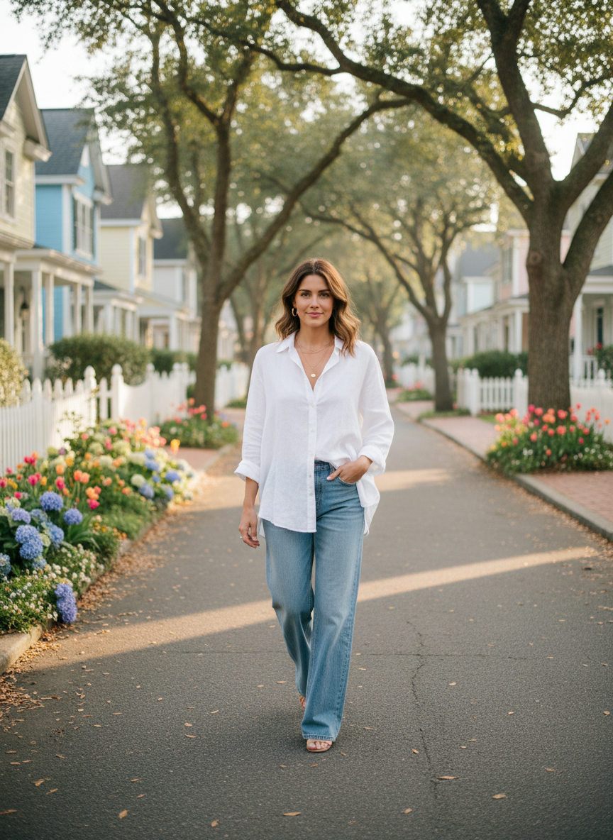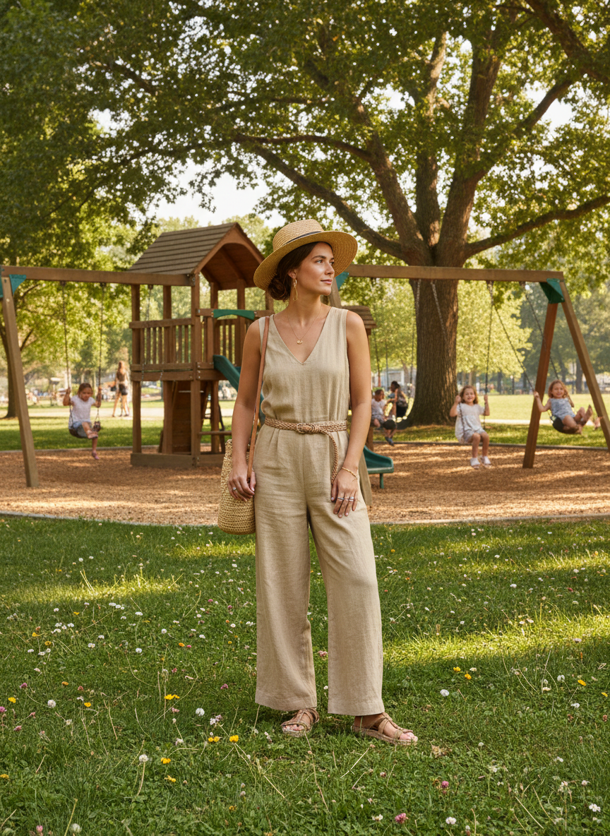 A linen jumpsuit is the ultimate one-and-done piece for busy mornings. The fabric breathes so well on those super hot afternoons at the playground. You get to look instantly polished without trying too hard to coordinate a top and bottom.