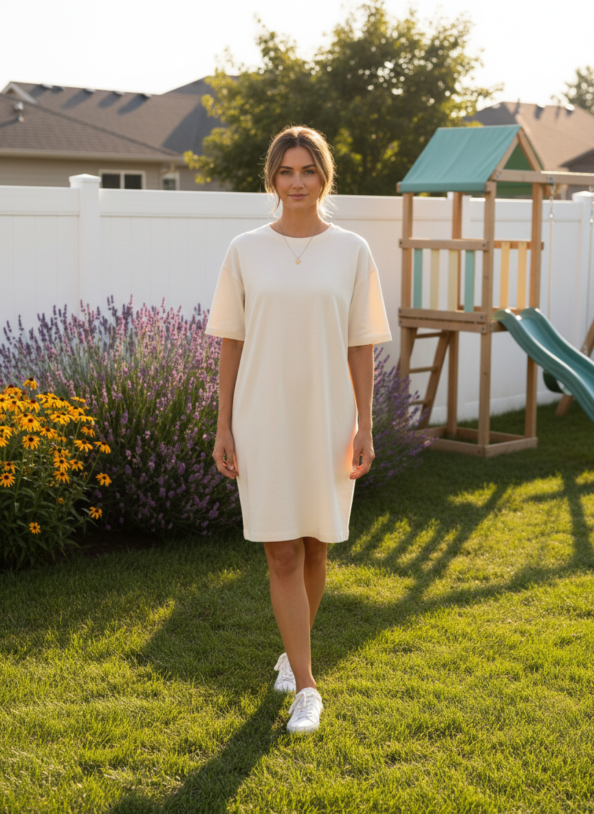 The humble t-shirt dress is a wardrobe hero for a reason. It is soft and stretchy enough to chase toddlers in comfortably. You can tie a denim jacket around your waist to add some shape. Add a baseball cap to hide messy hair on those crazy mornings.