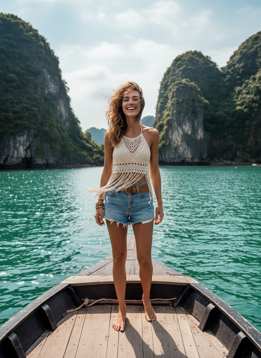 This combo is perfect for a boat trip in Ha Long Bay. The texture of the crochet adds a fun detail to your pictures. Denim shorts are durable and go with everything. You will look ready for the beach and the boat deck.