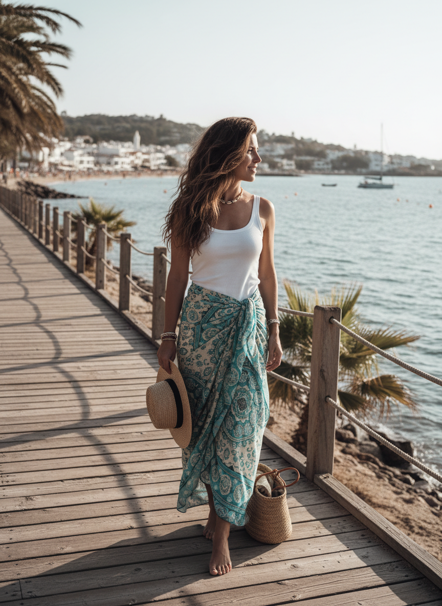 A sarong is the most versatile piece you can pack. Wrap it as a skirt and wear a simple white tank top. You can adjust the length to whatever feels comfortable. It dries fast and looks effortless for coastal towns.