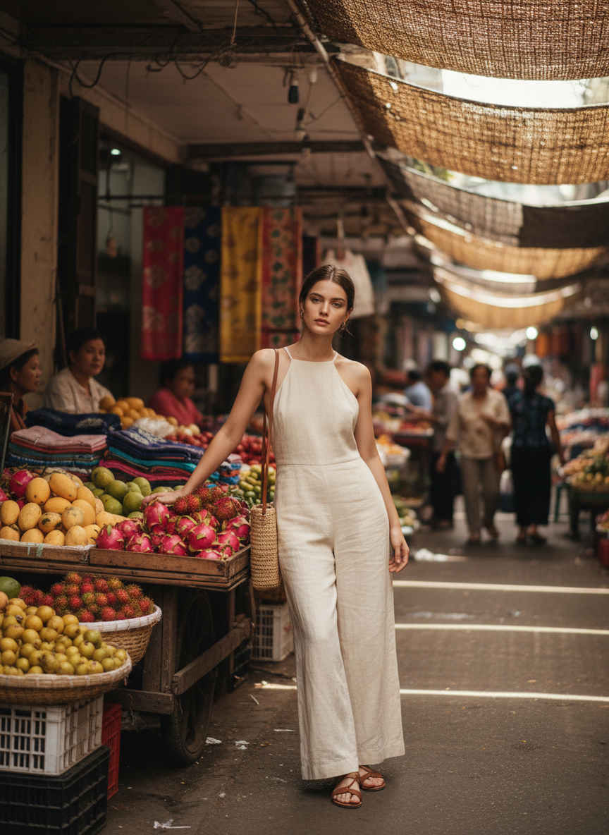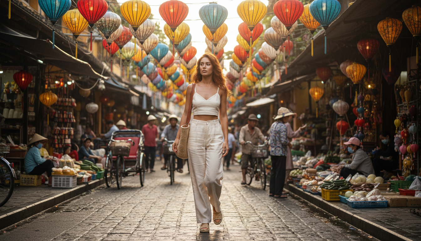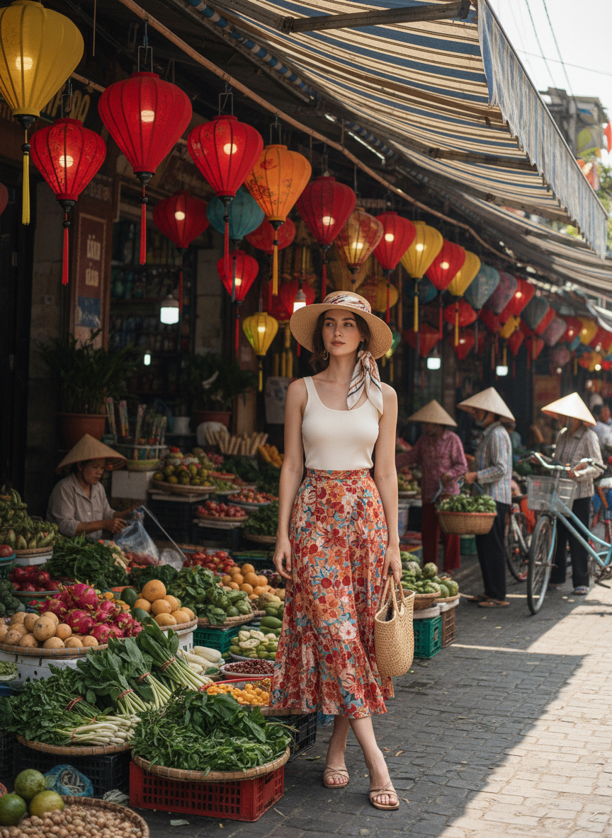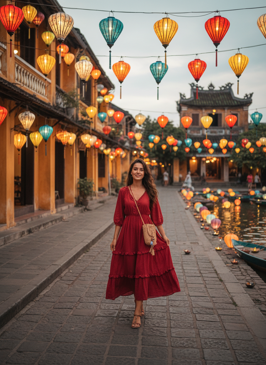 You need something colorful to match the glowing lanterns in Hoi An for the perfect photo. A bright yellow or red midi dress fits the magical vibe of the old town perfectly. Wear comfortable sandals because you will be walking a lot near the river.
