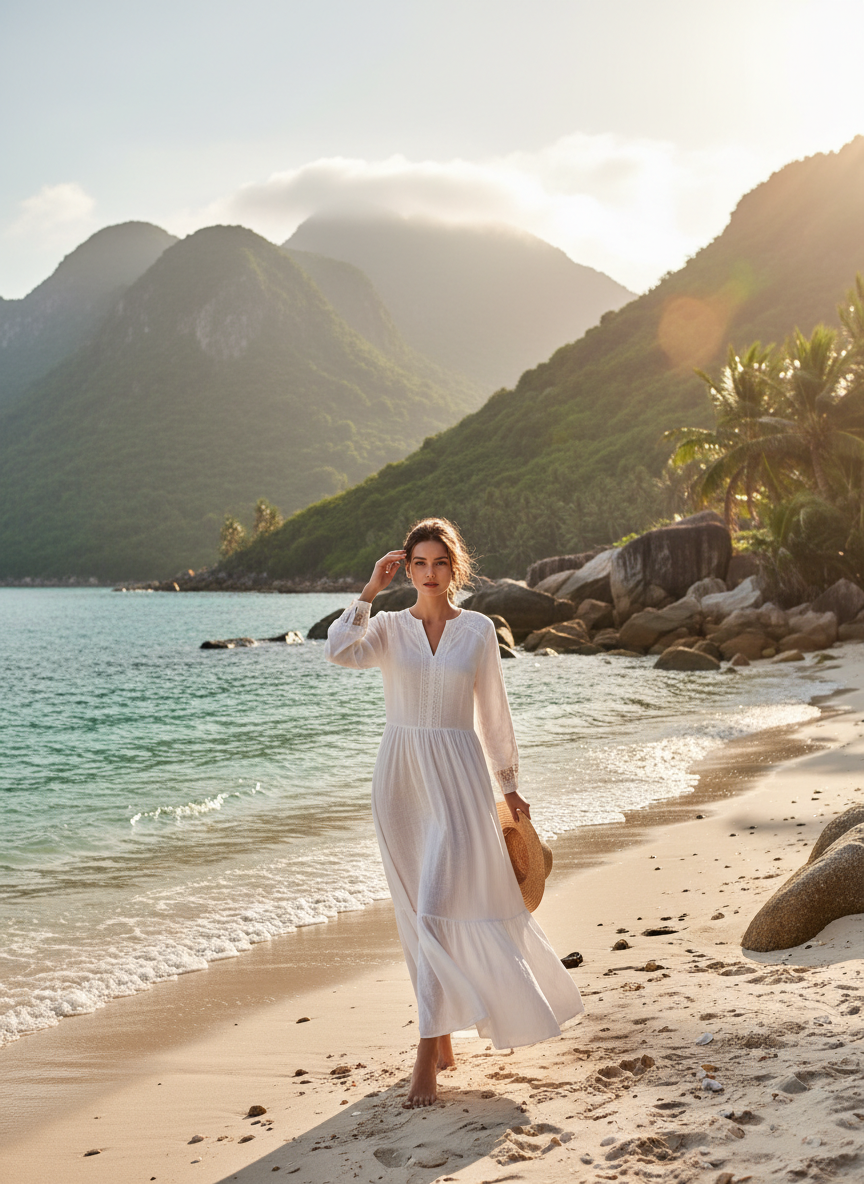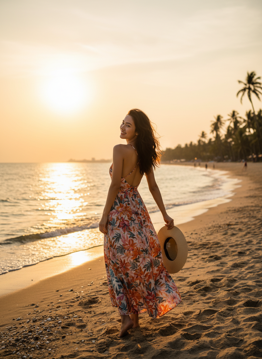 Show off your tan with a flirty backless dress for dinner by the beach in Da Nang. Choose a bright color like turquoise or coral to really pop in your sunset photos. The breeze feels amazing on your back after a hot day.