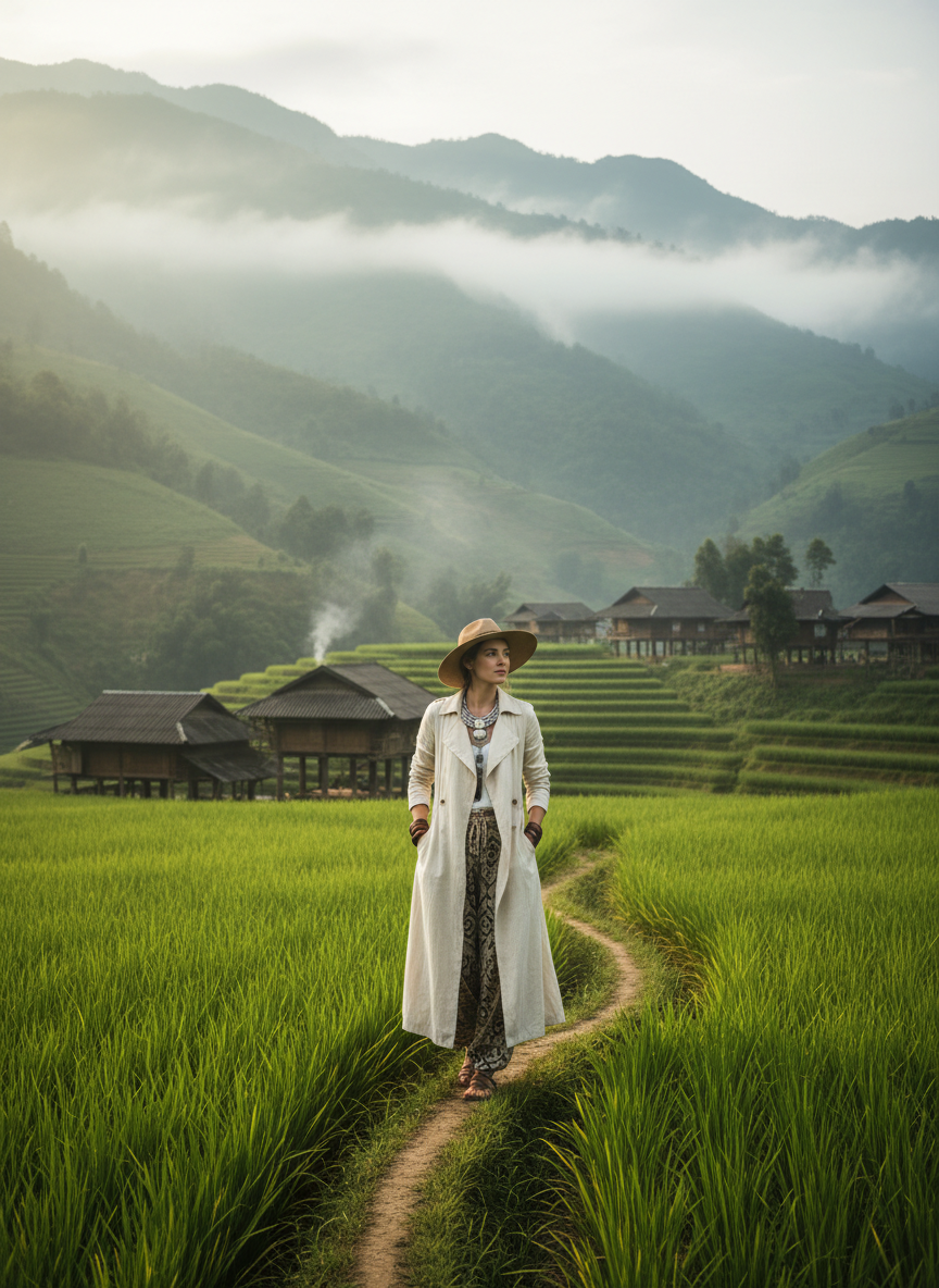 Sapa can get pretty chilly in the mountains so layers are absolutely key for this region. A lightweight trench coat over a turtleneck looks chic and keeps you warm while trekking through rice terraces.