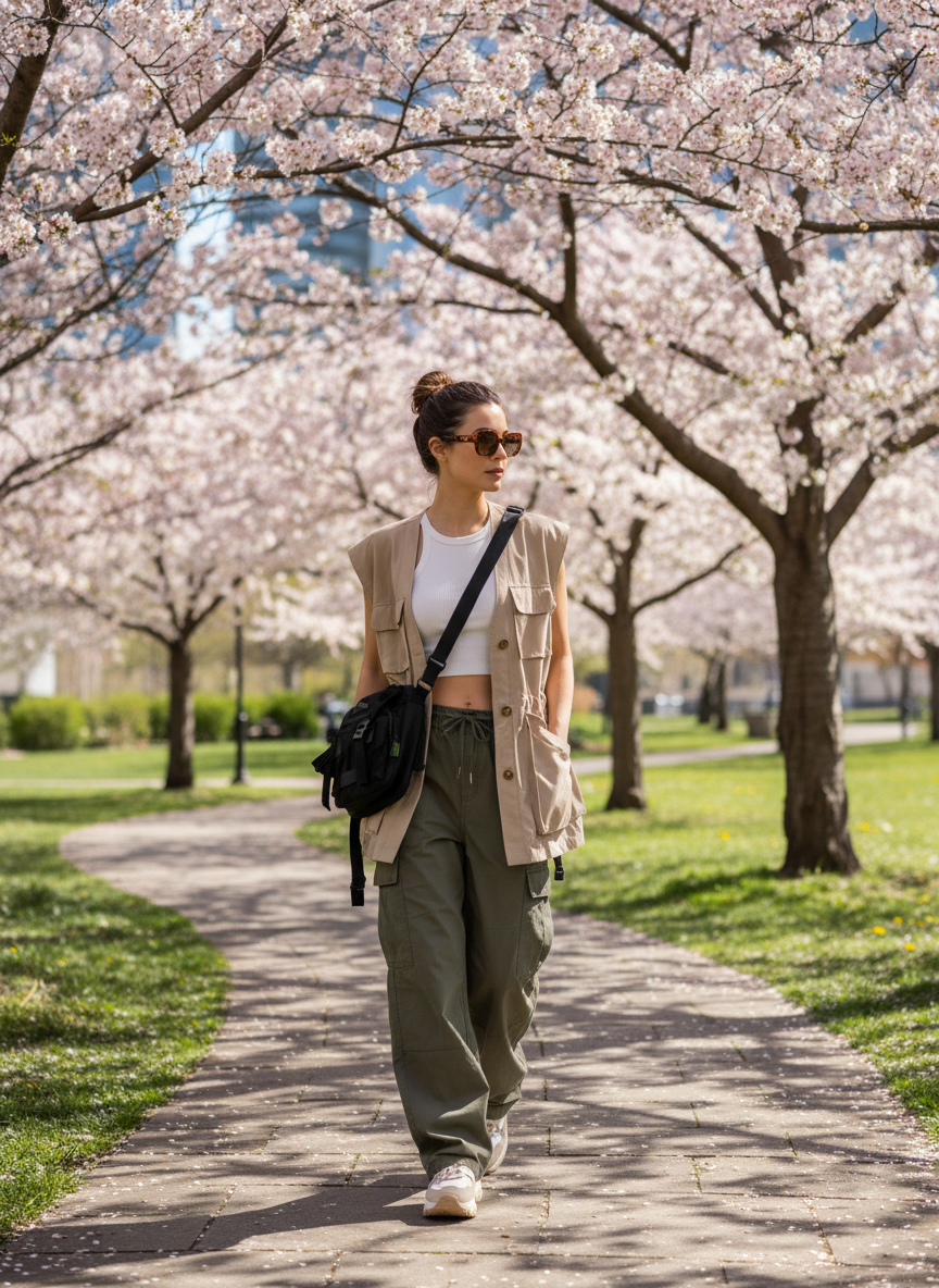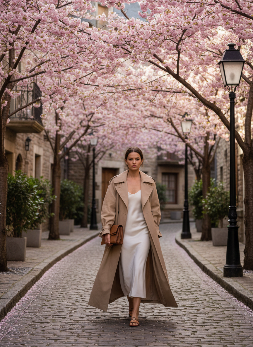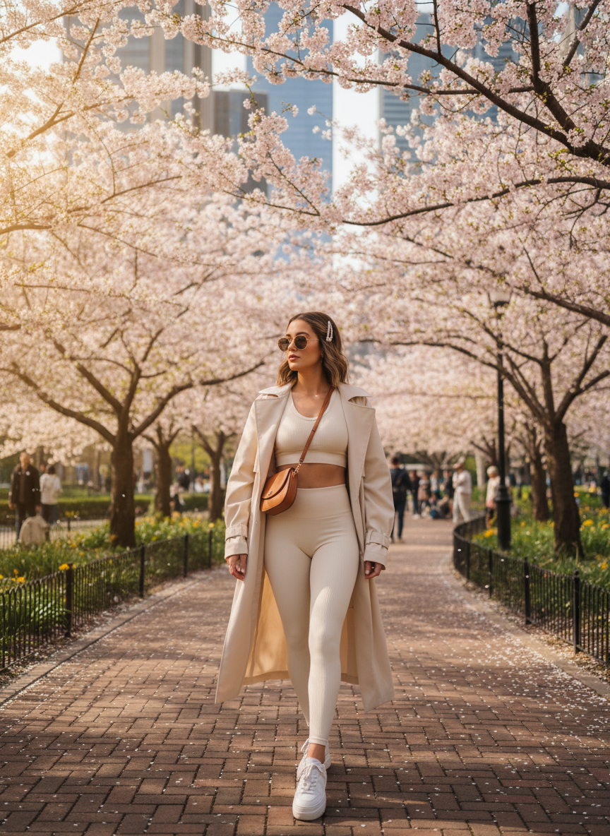 Sometimes you just want to stay comfortable while running errands. A matching yoga set in a cheerful spring color like peach or sky blue is ideal. Layer a trench coat over it to elevate the look with street style vibes. It’s one of the easiest spring outfits to pull off.